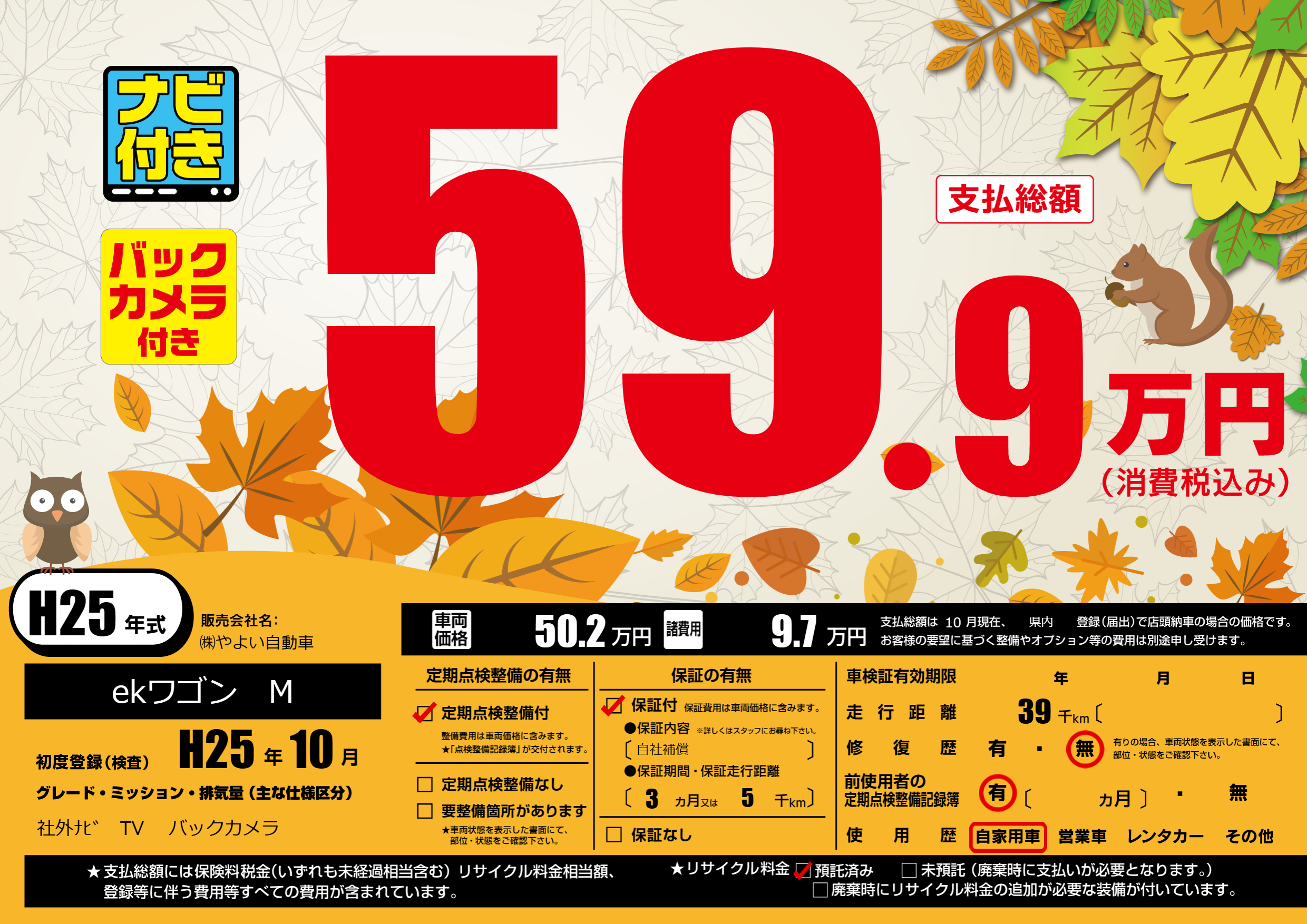 | 走行キロ | 3.9万km | 初年度登録 | H25年10月 |