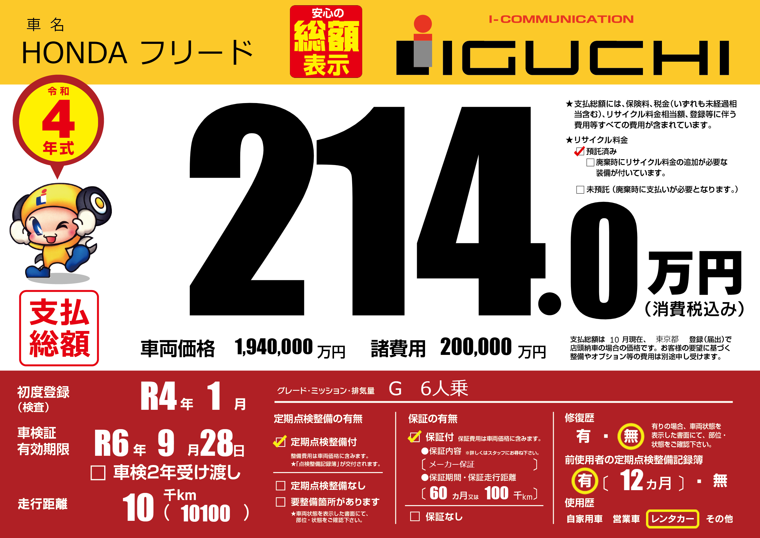 | 車名 | HONDA フリード | グレード ミッション 排気量 |