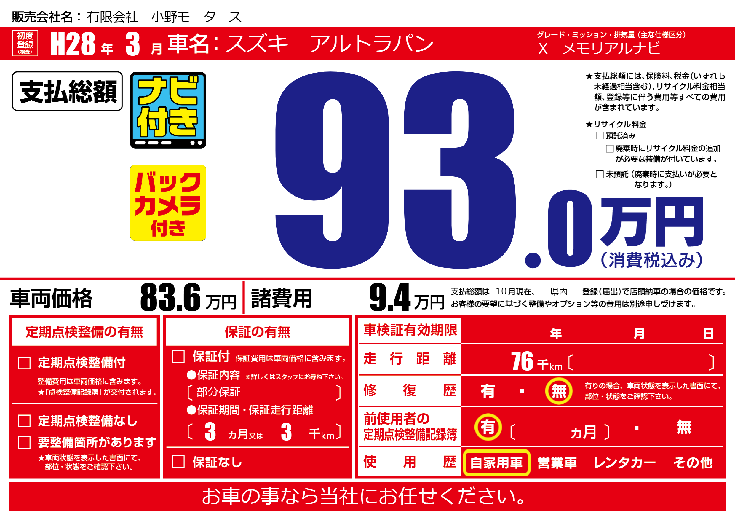 | 走行キロ | 7.6万km | 初年度登録 | H28年3月 |