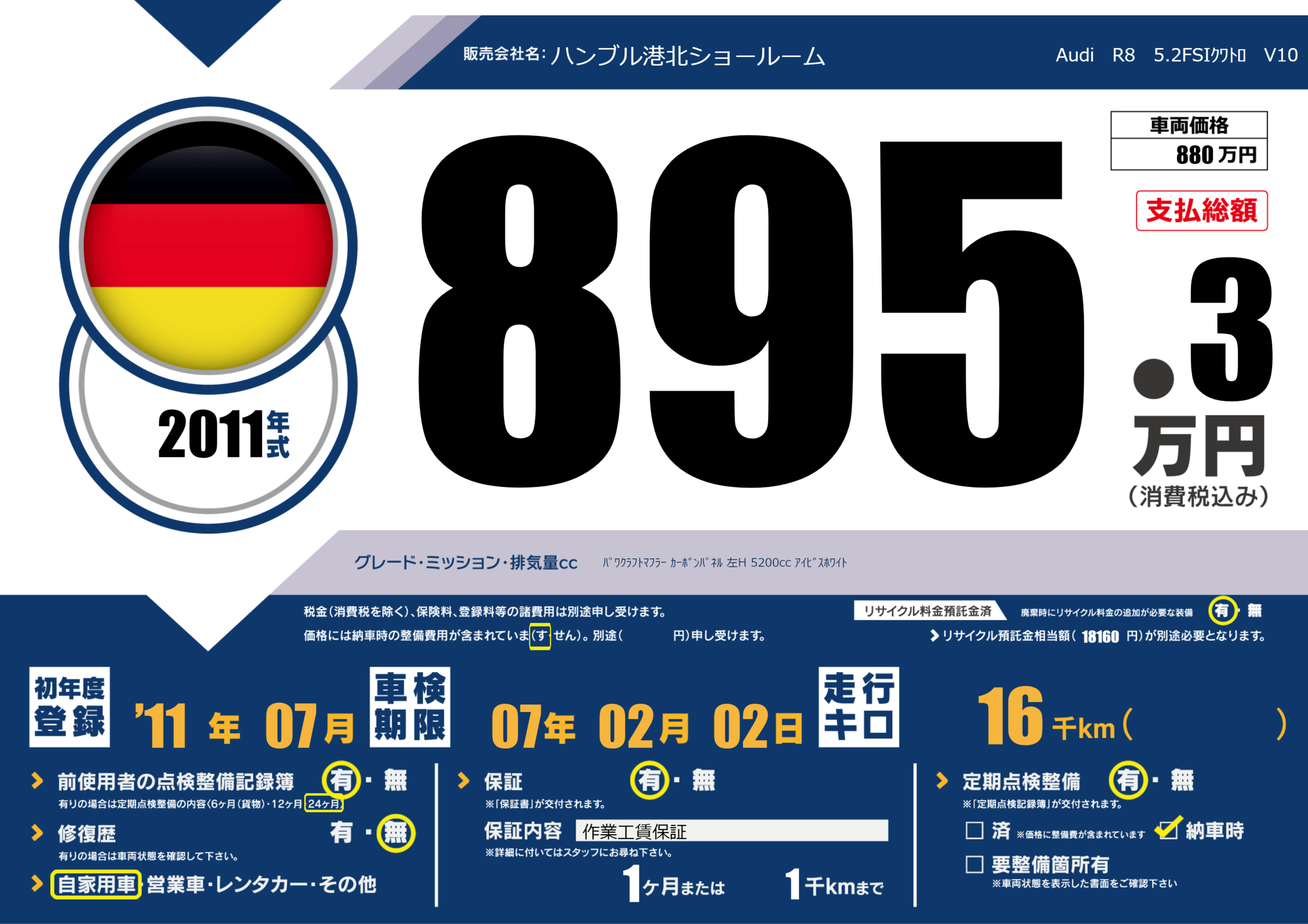 | 車名 | Audi R8 5.2FSIクワトロ V10 | グレード ミッション 排気量 |