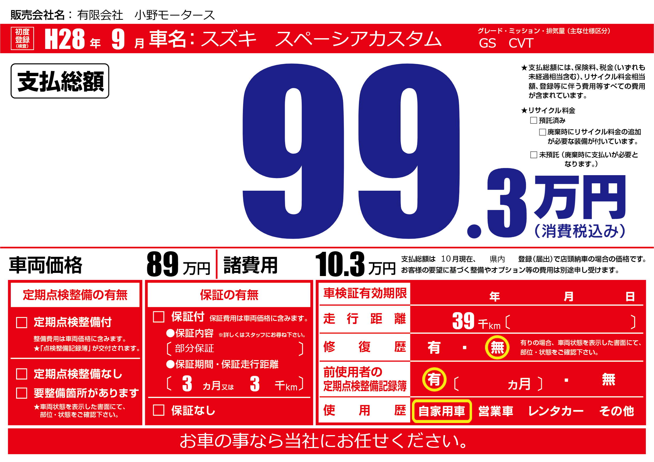 | 走行キロ | 3.9万km | 初年度登録 | H28年9月 |