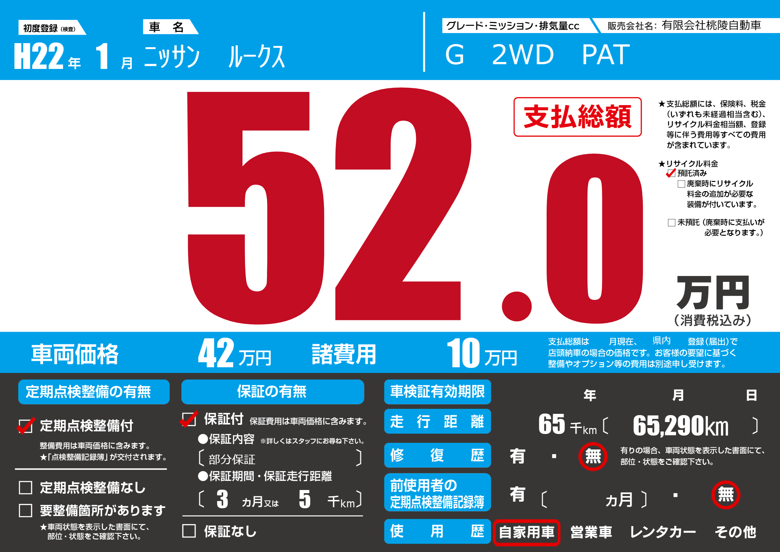 | 走行キロ | 6.5万km | 初年度登録 | H22年1月 |