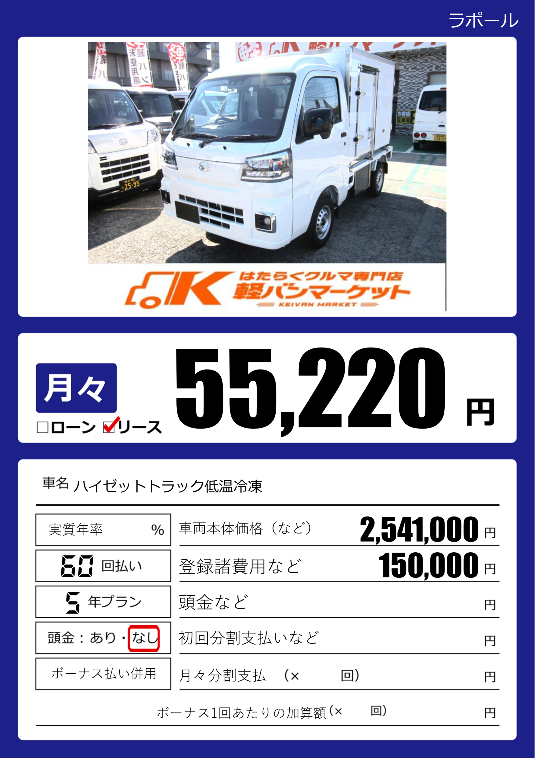 | 車名 | ハイゼットトラック低温冷凍 | グレード ミッション 排気量 |