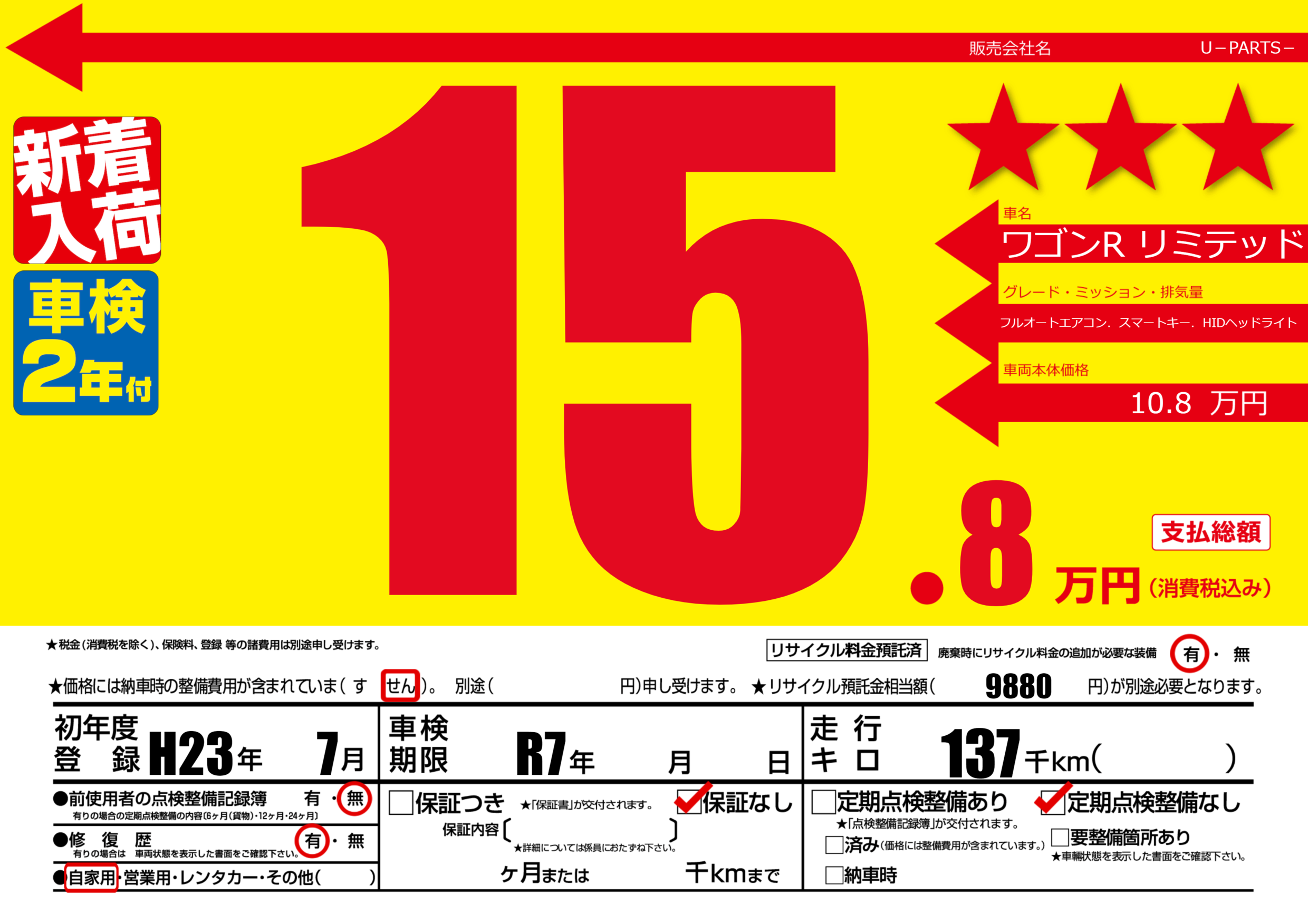 なし | 車検制限 | R7年---月---月 |
