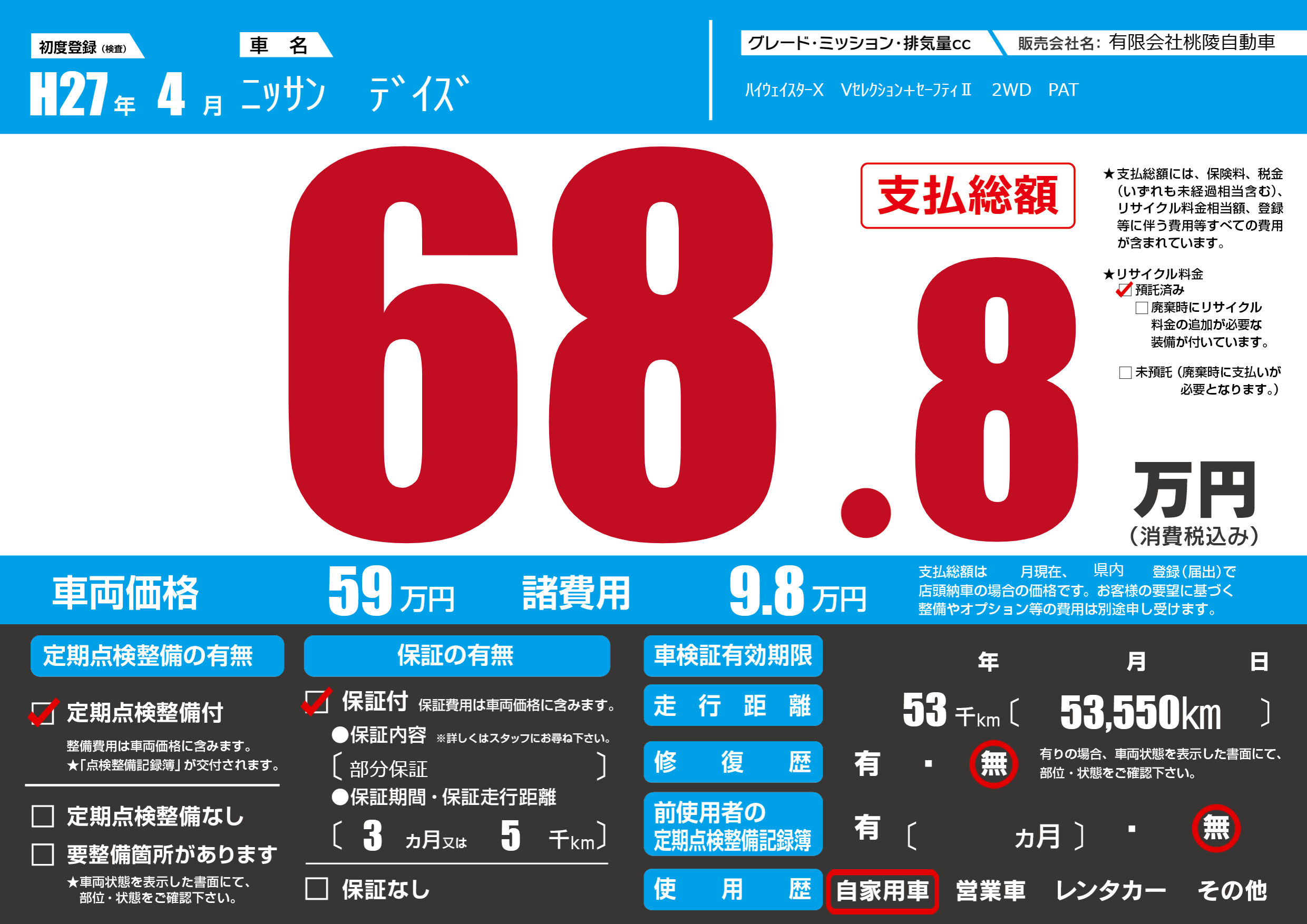 | 車名 | ニッサン デイズ | グレード ミッション 排気量 |