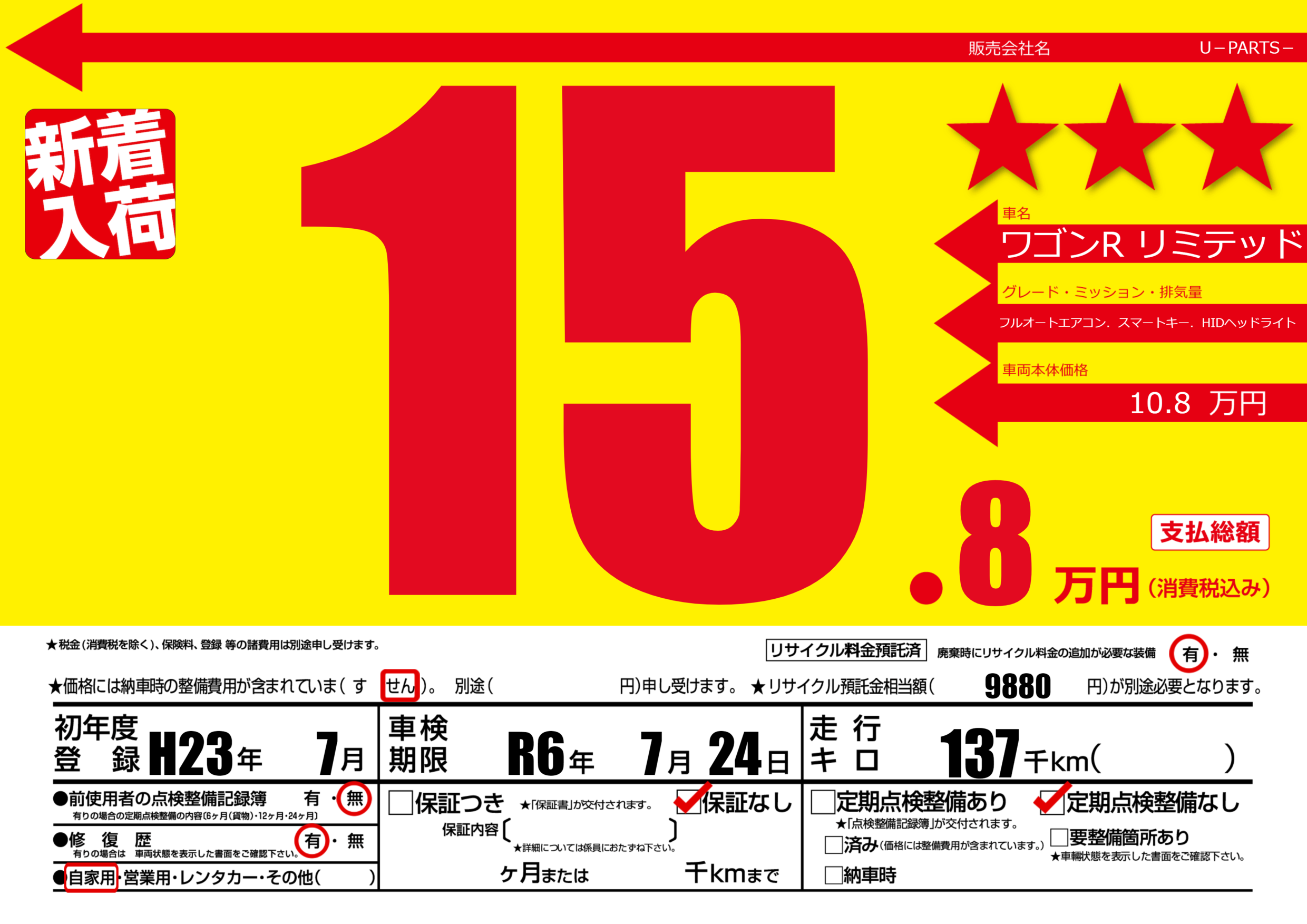 | 車名 | ワゴンR リミテッド | グレード ミッション 排気量 |