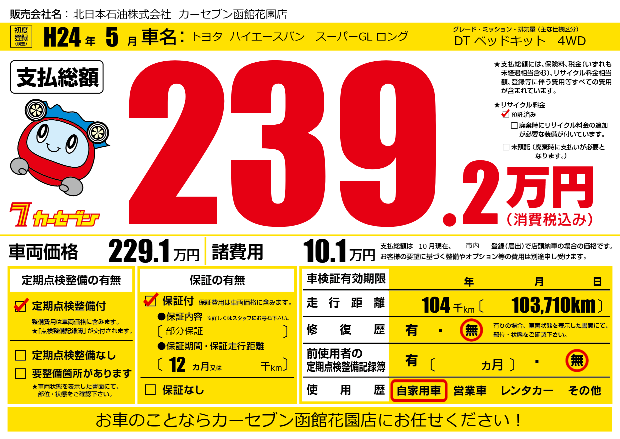 | 走行キロ | 10.4万km | 初年度登録 | H24年5月 |