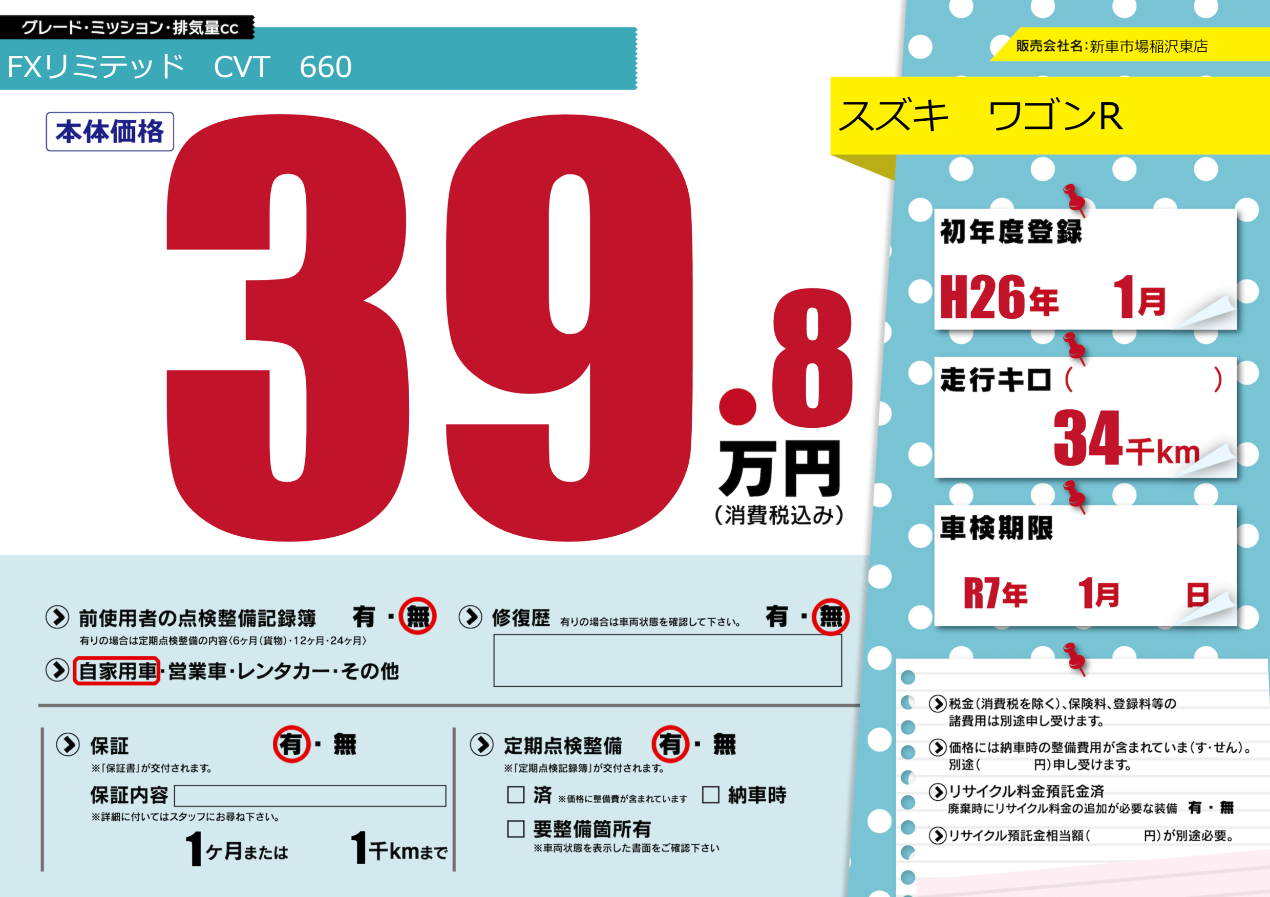 なし | 車検制限 | R7年1月---月 |