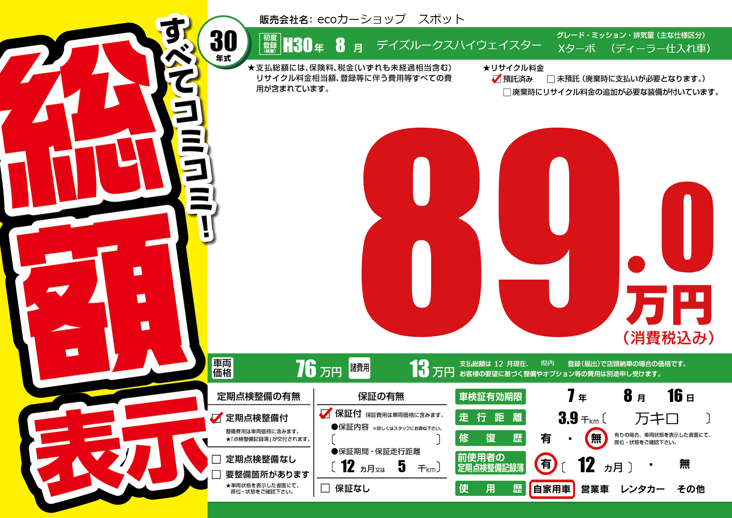 | 車名 | デイズルークスハイウェイスター | グレード ミッション 排気量 |