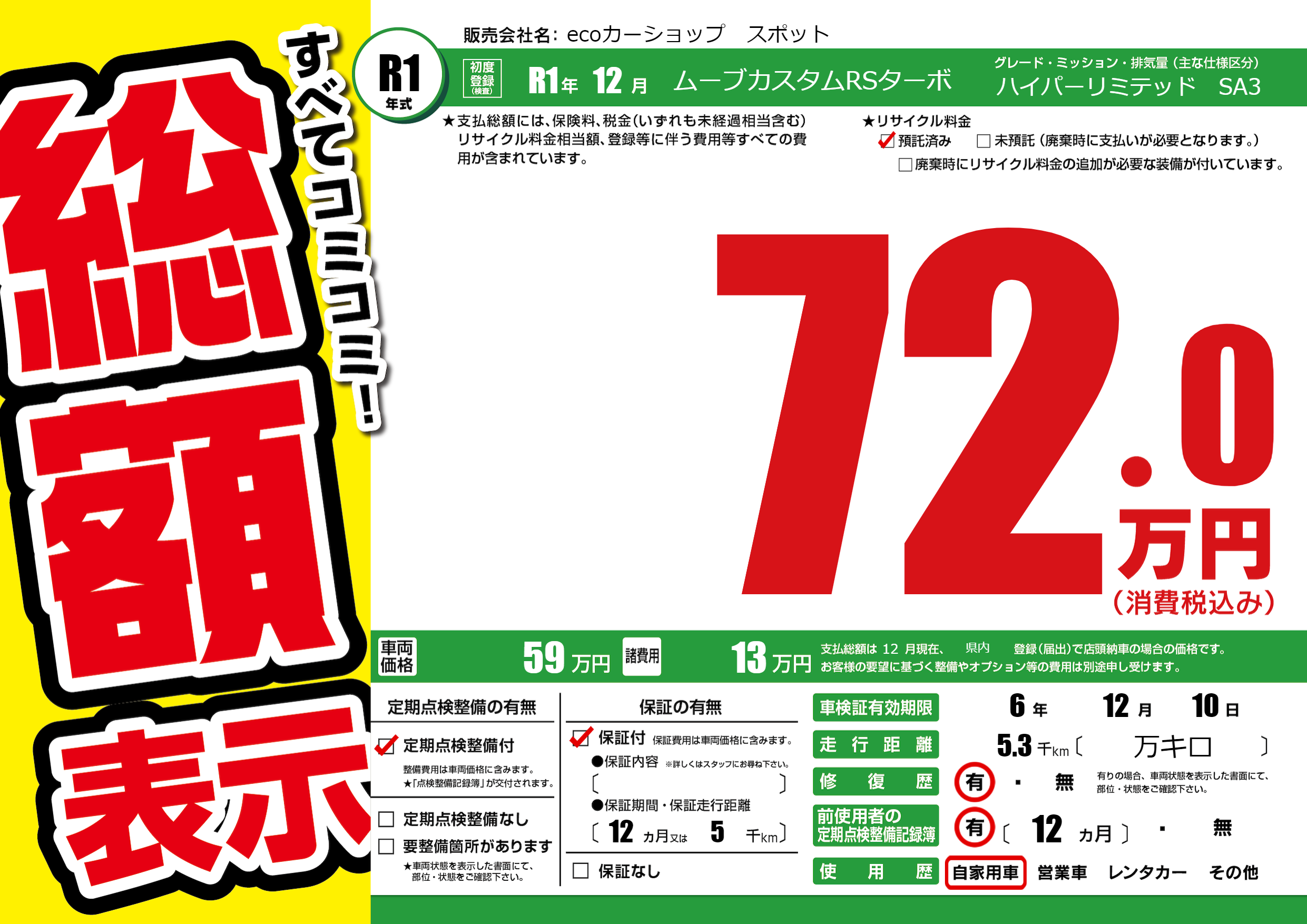 | 車名 | ムーブカスタムRSターボ | グレード ミッション 排気量 |