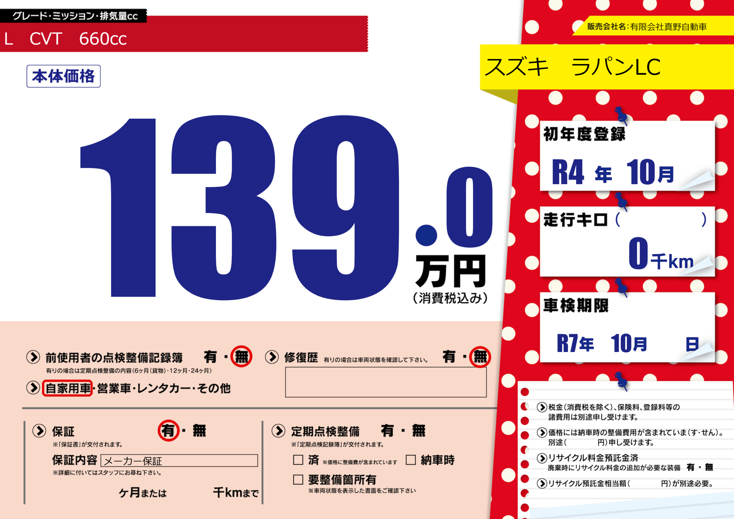 なし | 車検制限 | R7年10月---月 |