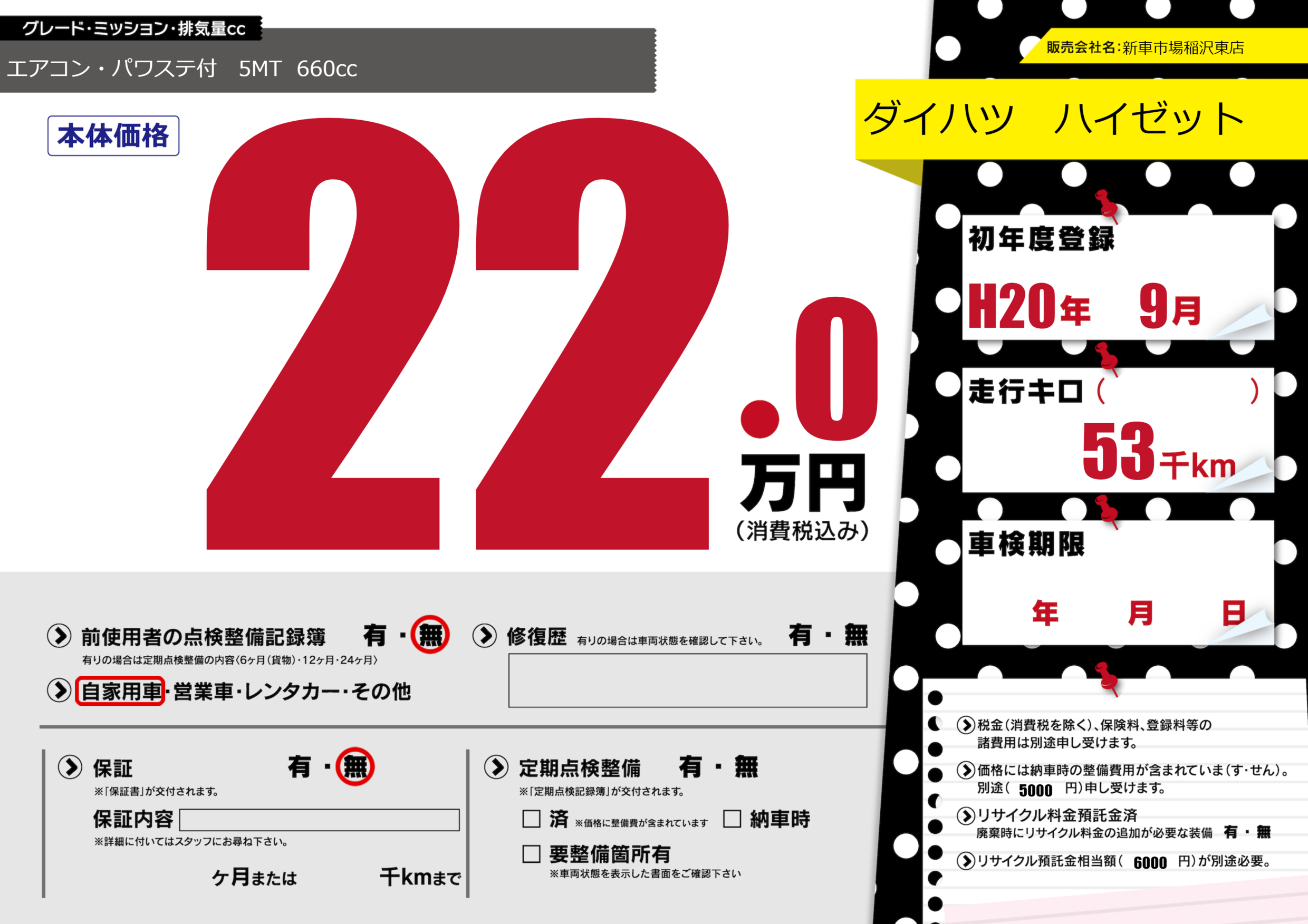 | 車名 | ダイハツ ハイゼット | グレード ミッション 排気量 |