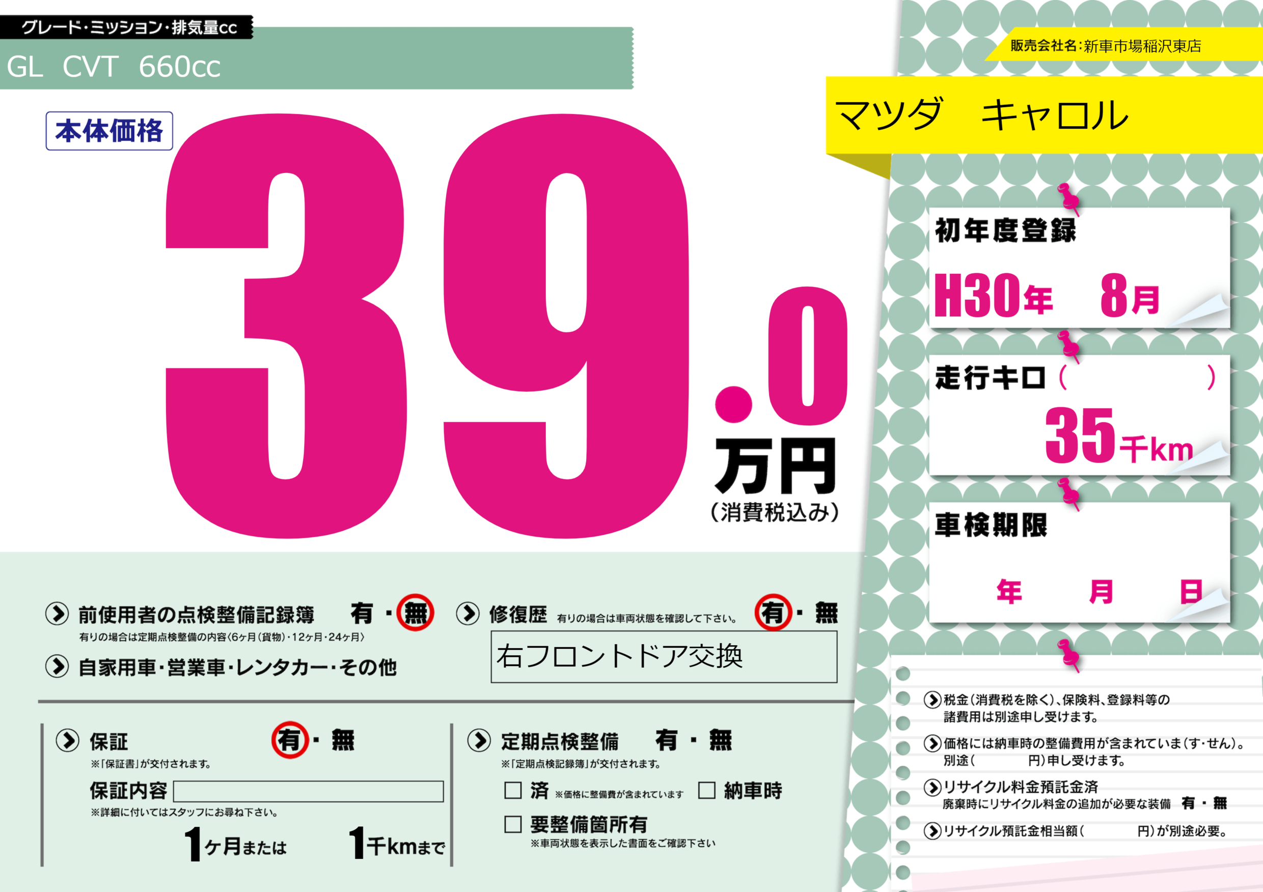 | 車名 | マツダ キャロル | グレード ミッション 排気量 |