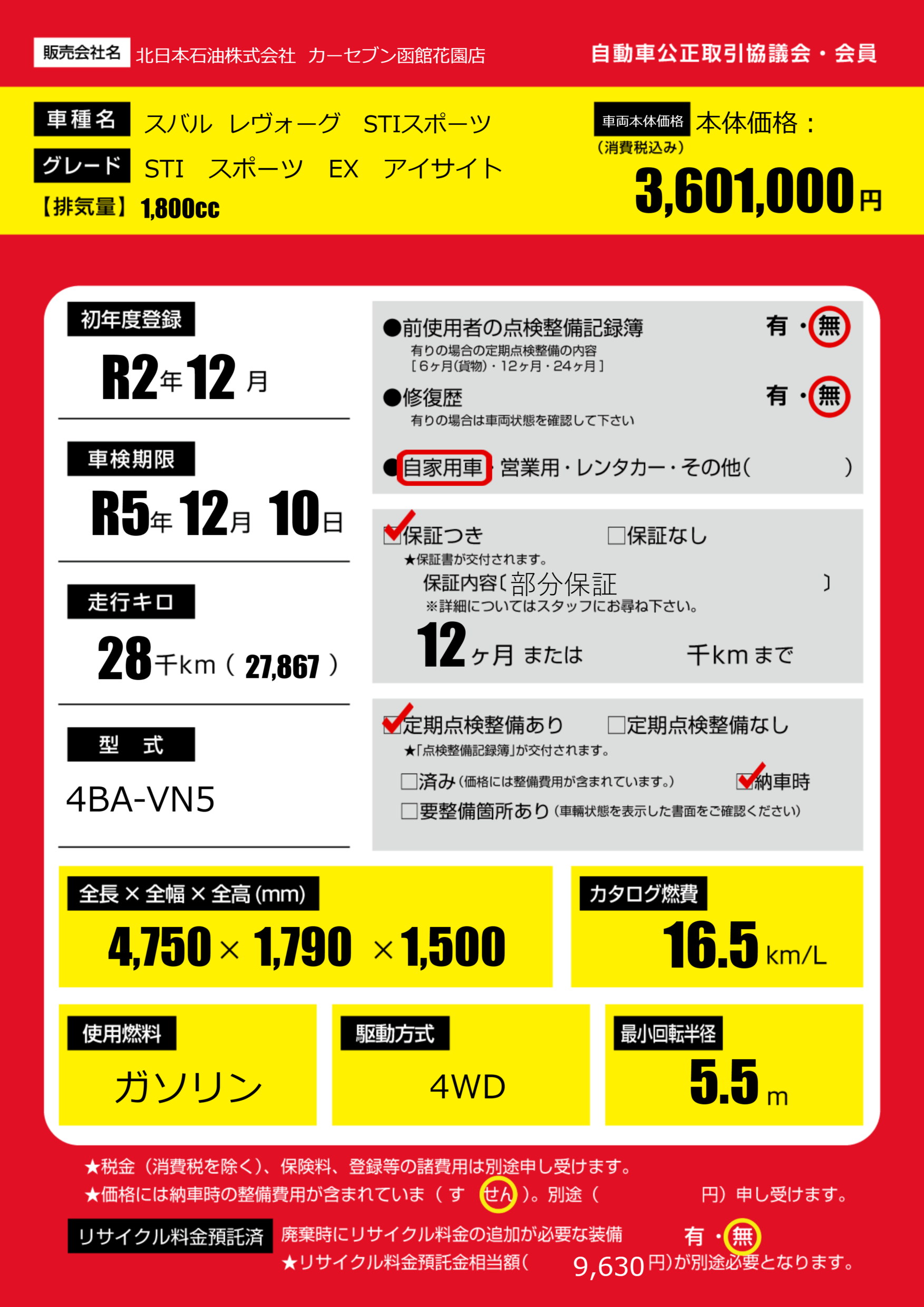 | 車名 | スバル レヴォーグ STIスポーツ | グレード ミッション 排気量 |