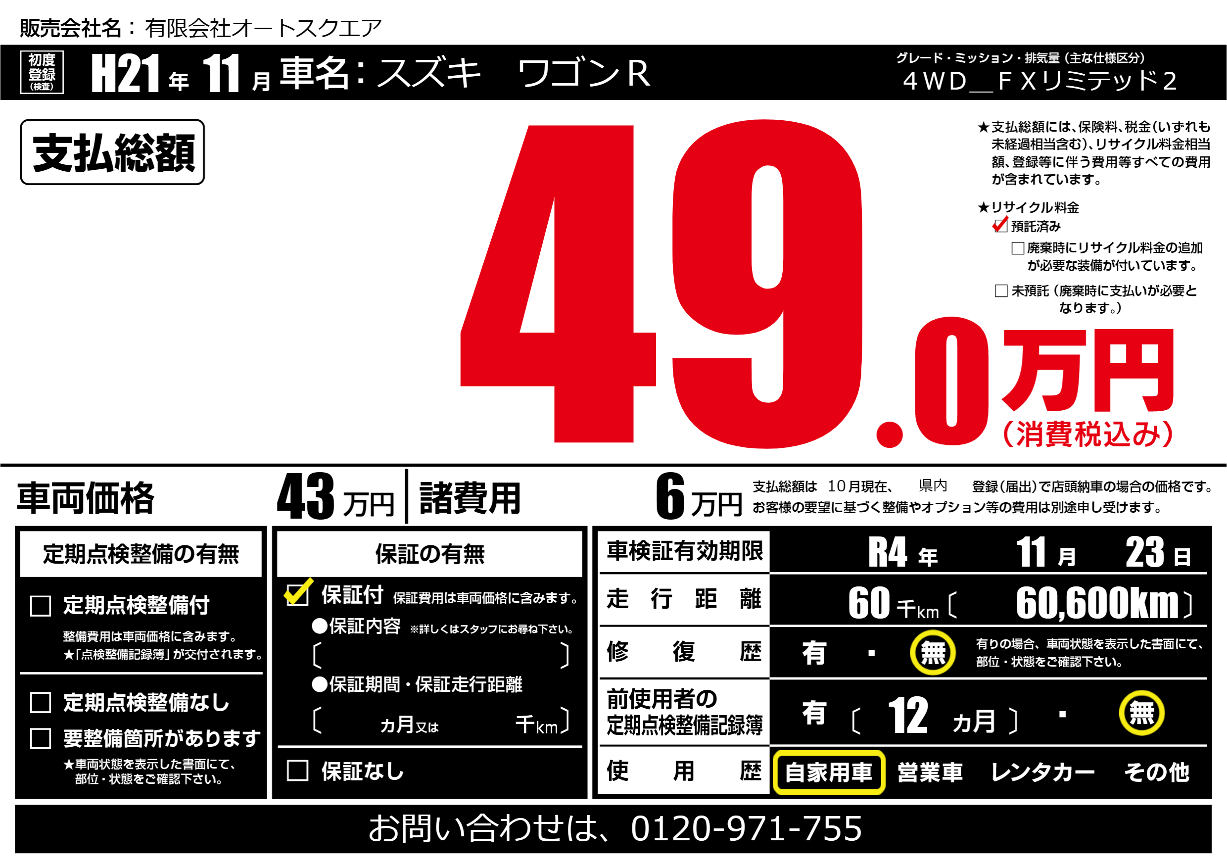 | 走行キロ | 6万km | 初年度登録 | H21年11月 |
