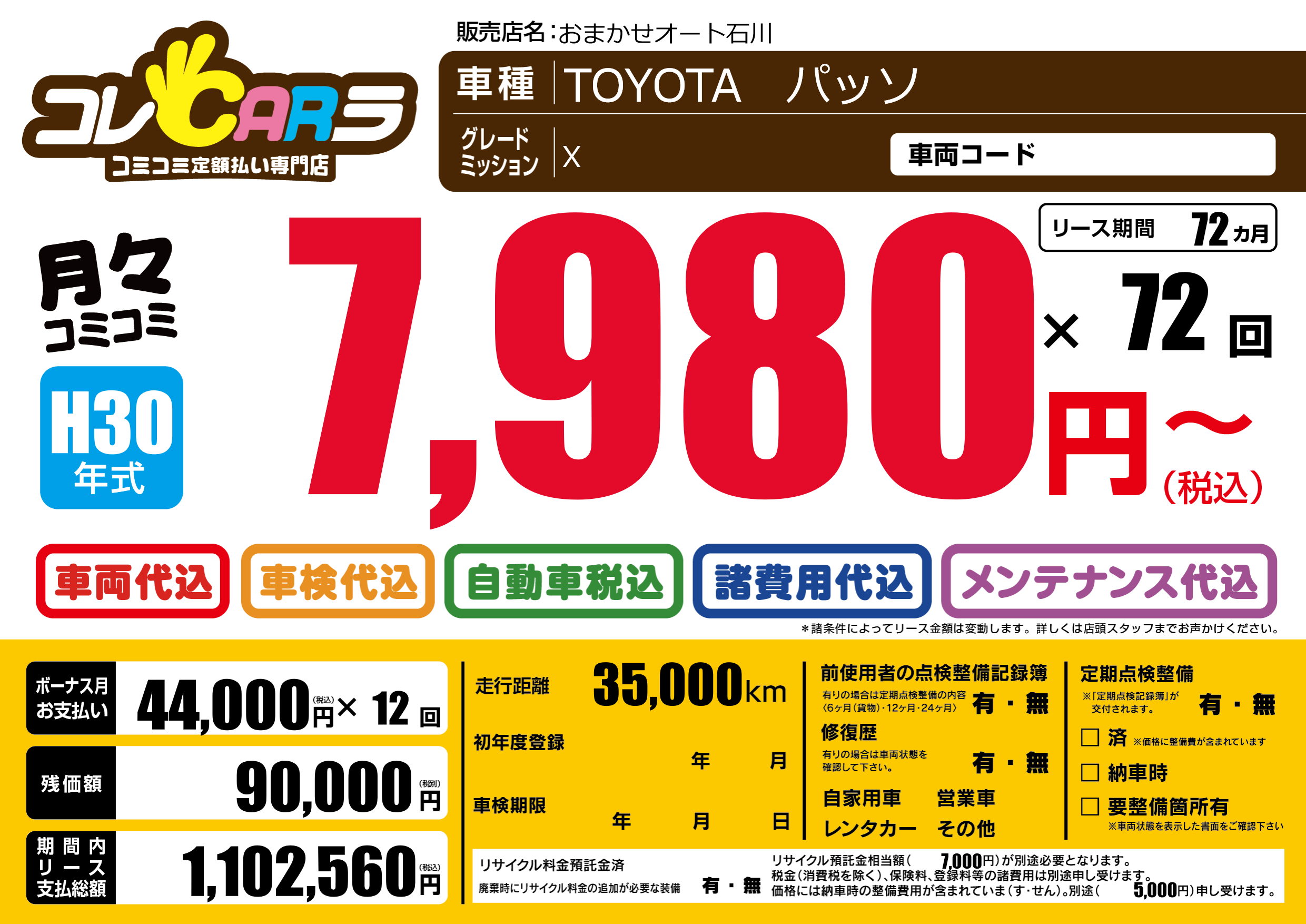 | 車名 | TOYOTA パッソ | グレード ミッション 排気量 |