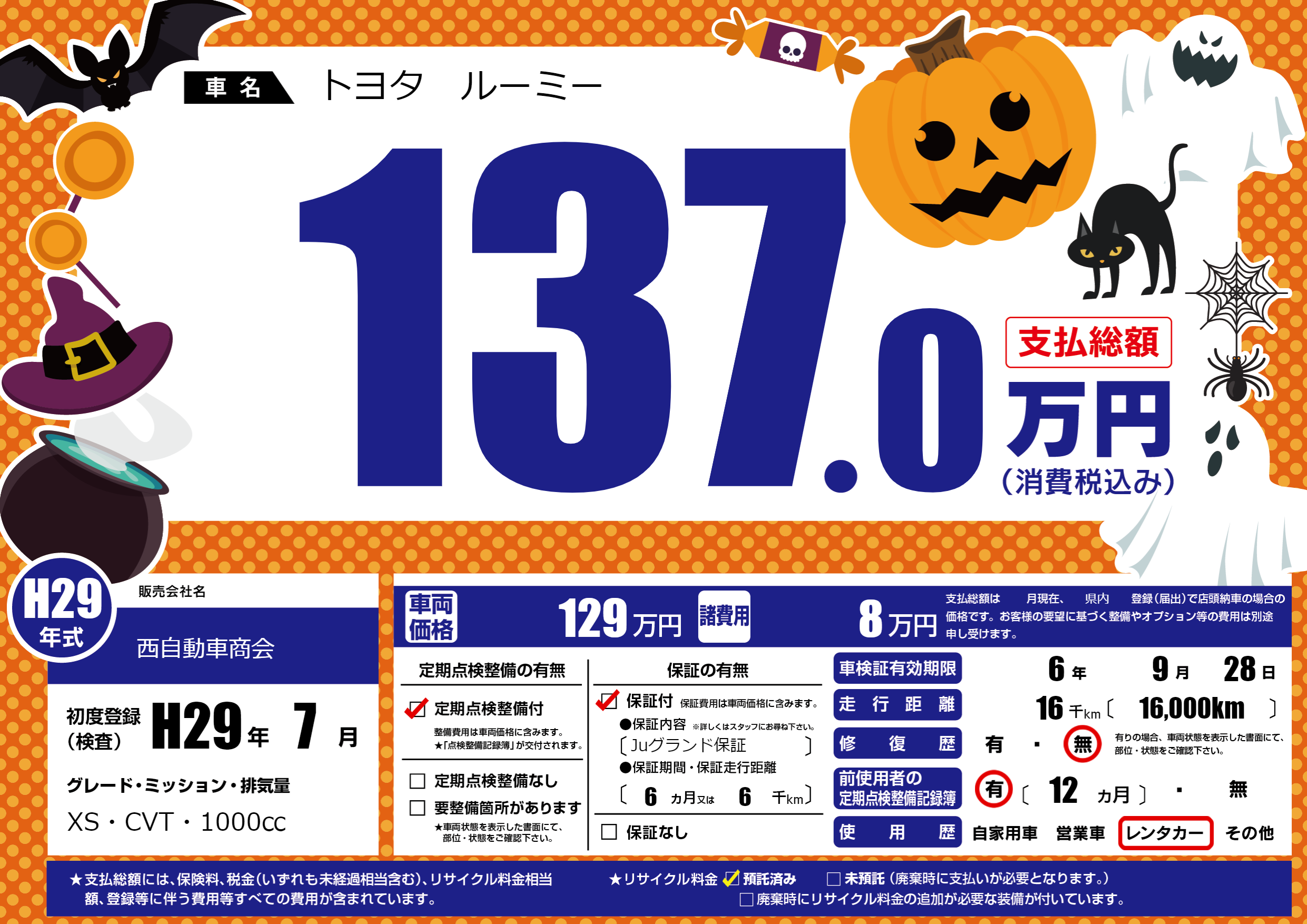 | 車名 | トヨタ ルーミー | グレード ミッション 排気量 |