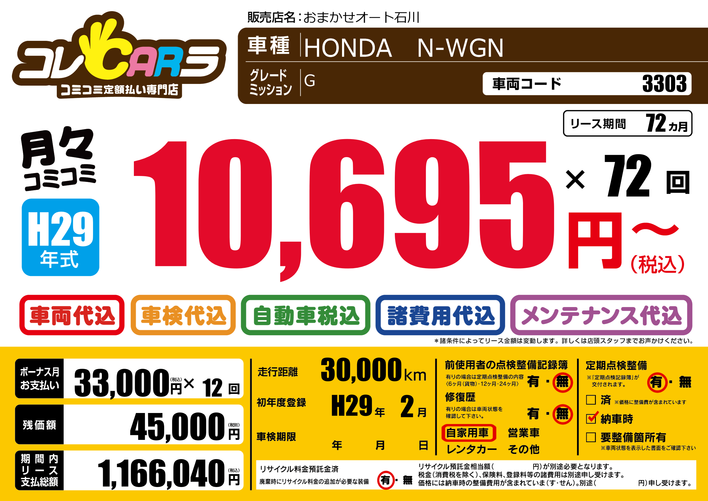 | 車名 | HONDA N-WGN | グレード ミッション 排気量 |