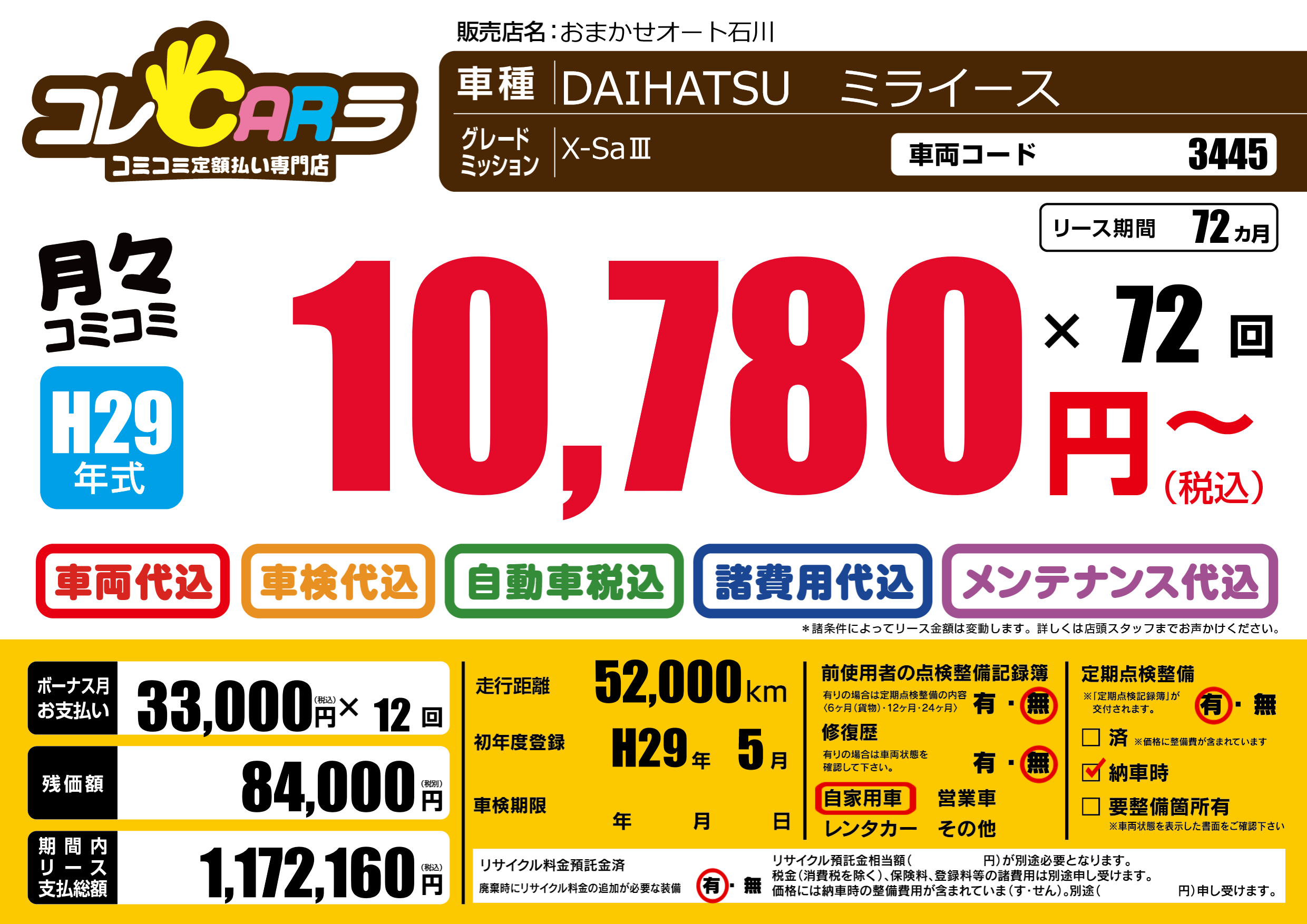 | 車名 | DAIHATSU ミライース | グレード ミッション 排気量 |