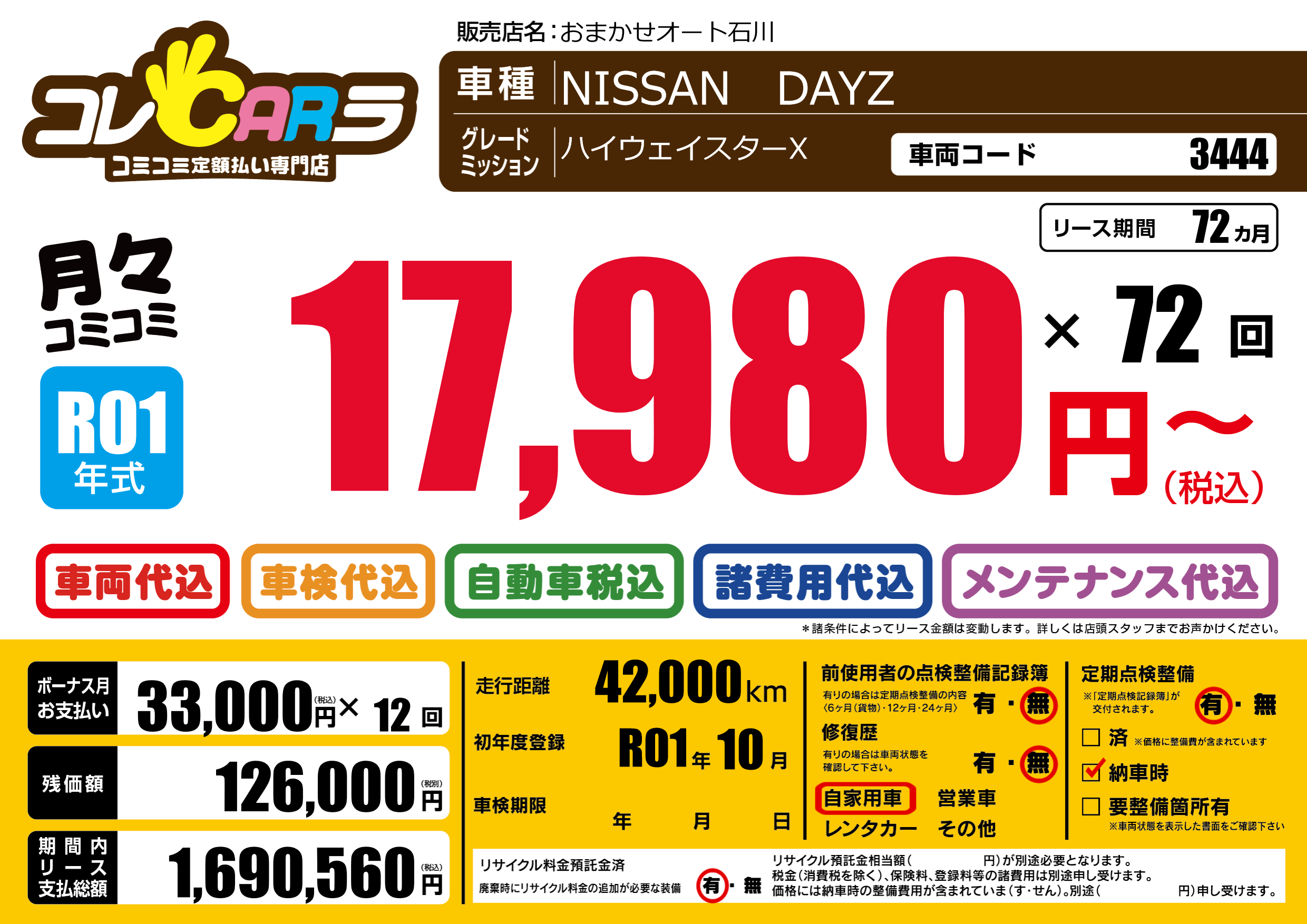 | 車名 | NISSAN DAYZ | グレード ミッション 排気量 |