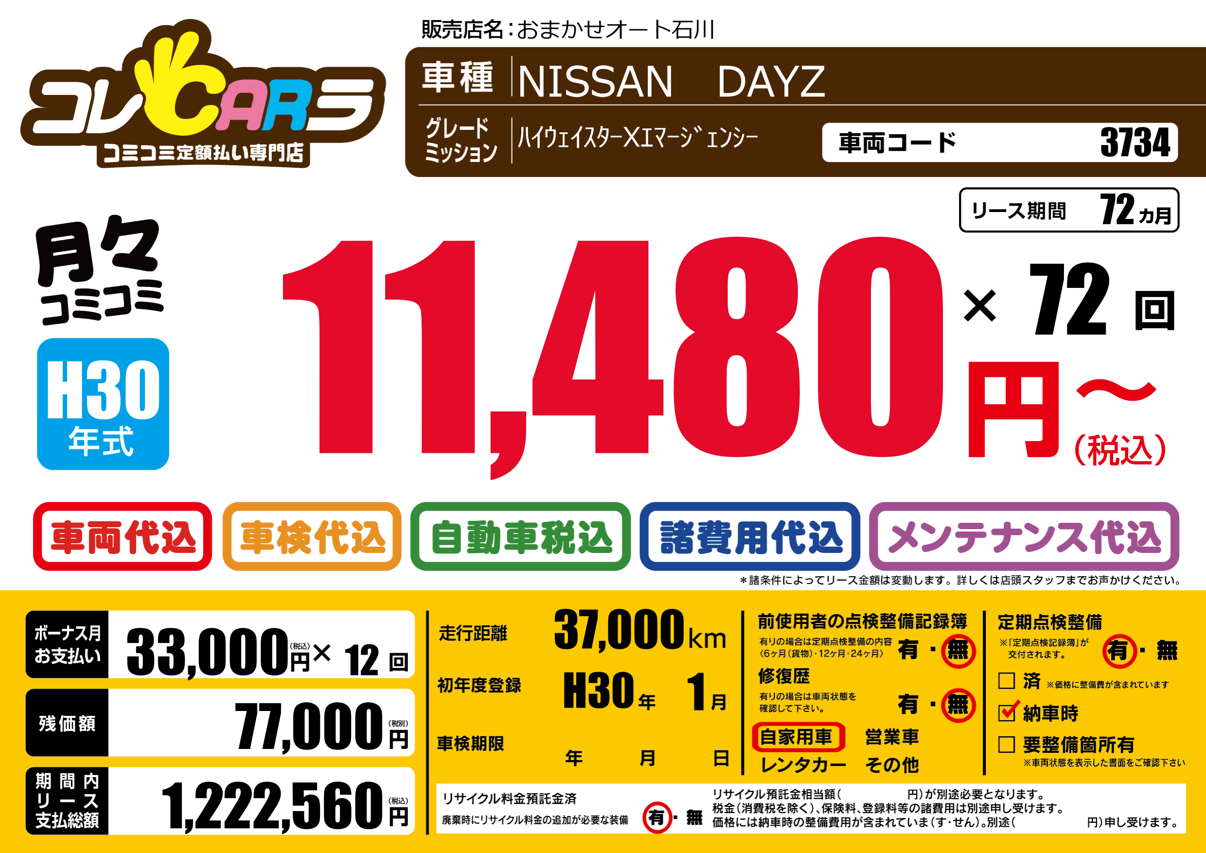 | 車名 | NISSAN DAYZ | グレード ミッション 排気量 |
