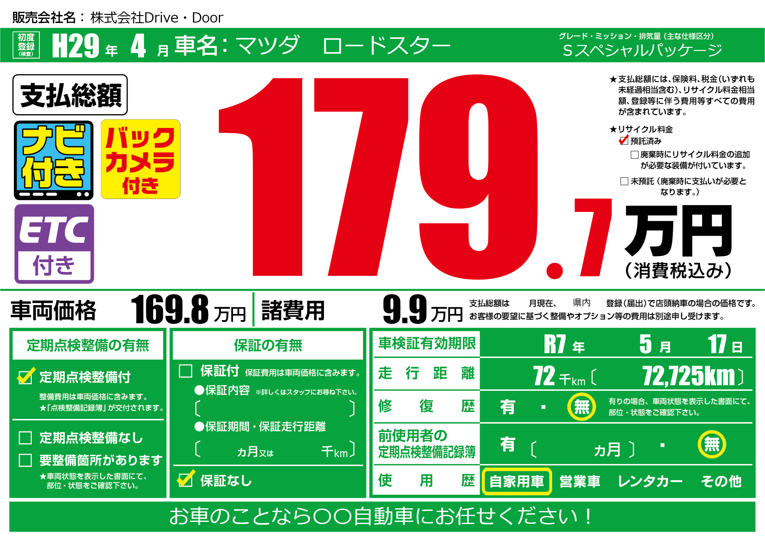 | 走行キロ | 7.2万km | 初年度登録 | H29年4月 |