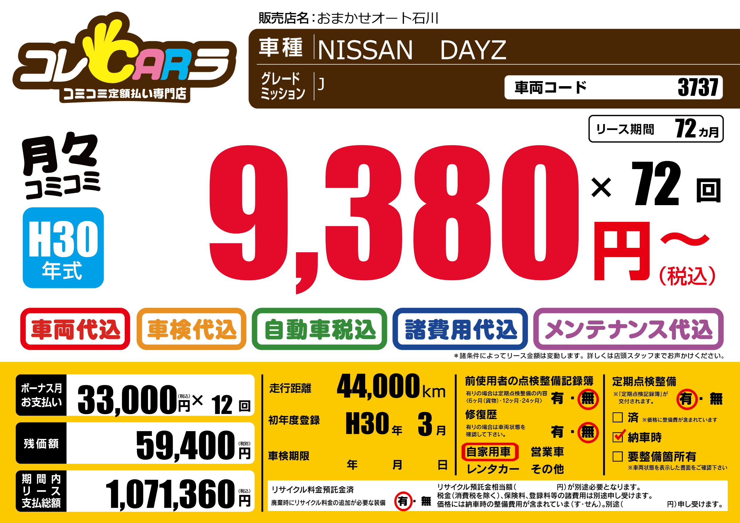 | 車名 | NISSAN DAYZ | グレード ミッション 排気量 |