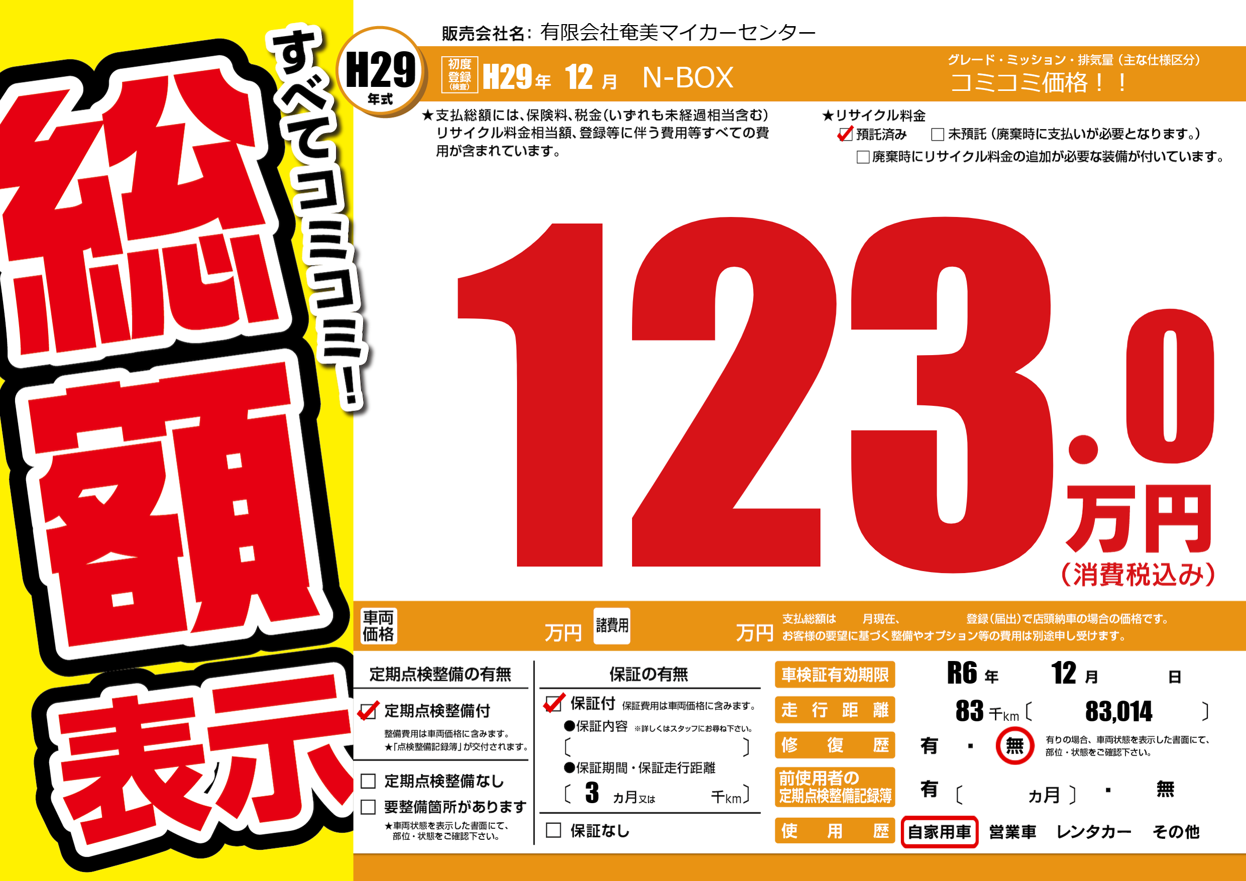 | 走行キロ | 8.3万km | 初年度登録 | H29年12月 |
