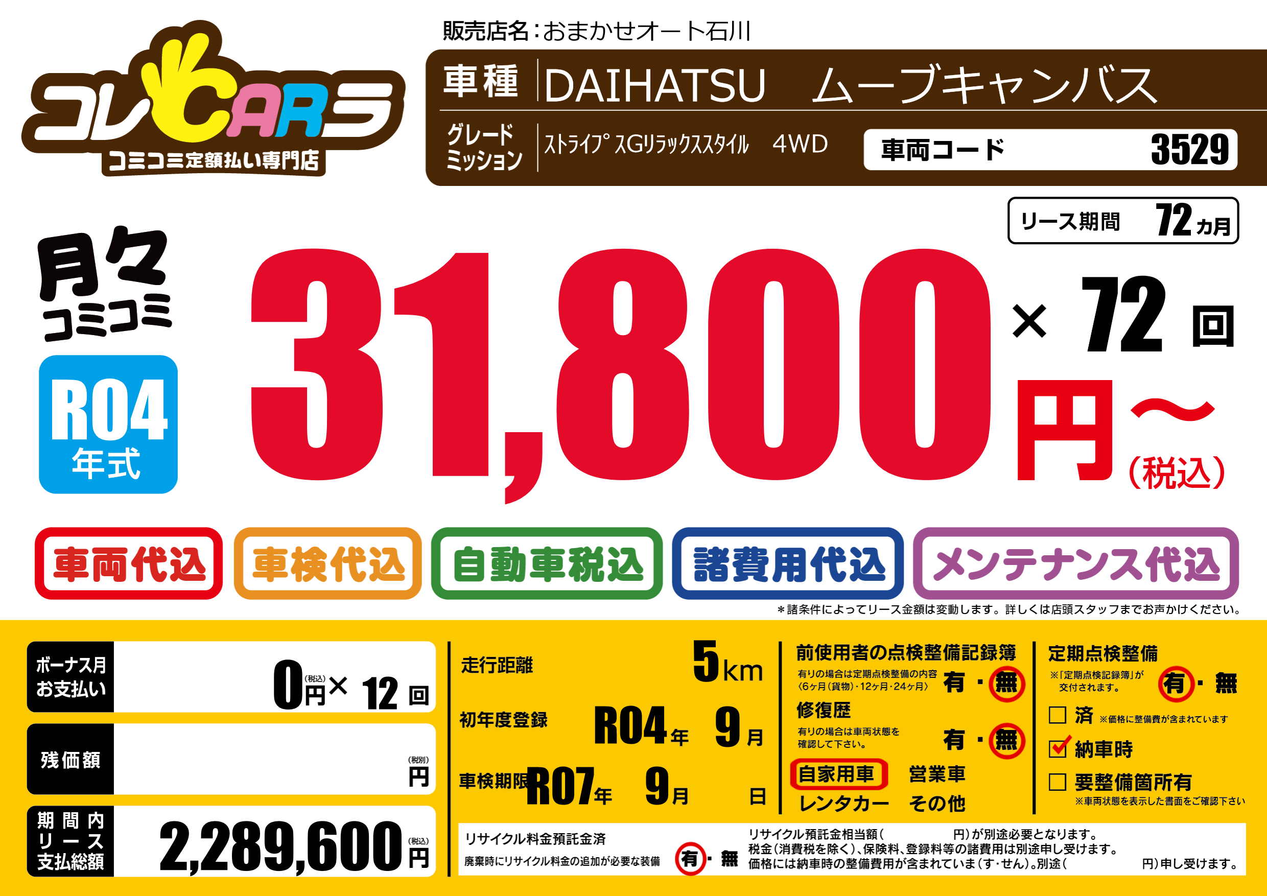 | 車名 | DAIHATSU ムーブキャンバス | グレード ミッション 排気量 |