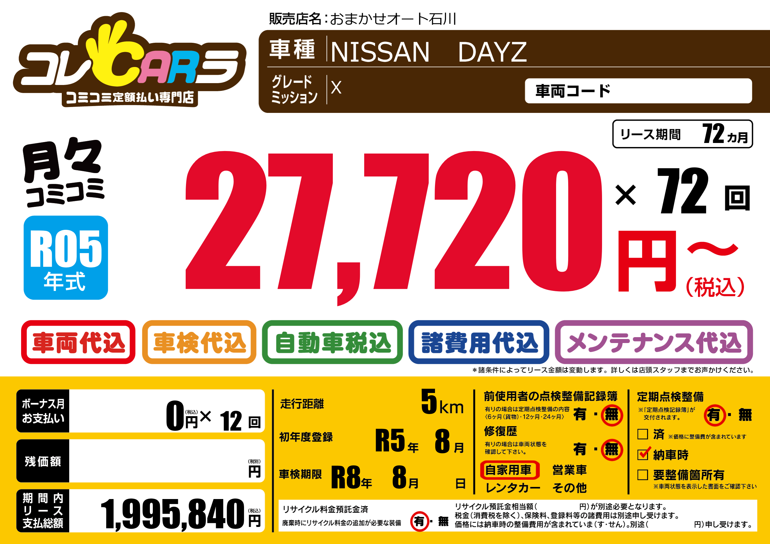 | 車名 | NISSAN DAYZ | グレード ミッション 排気量 |
