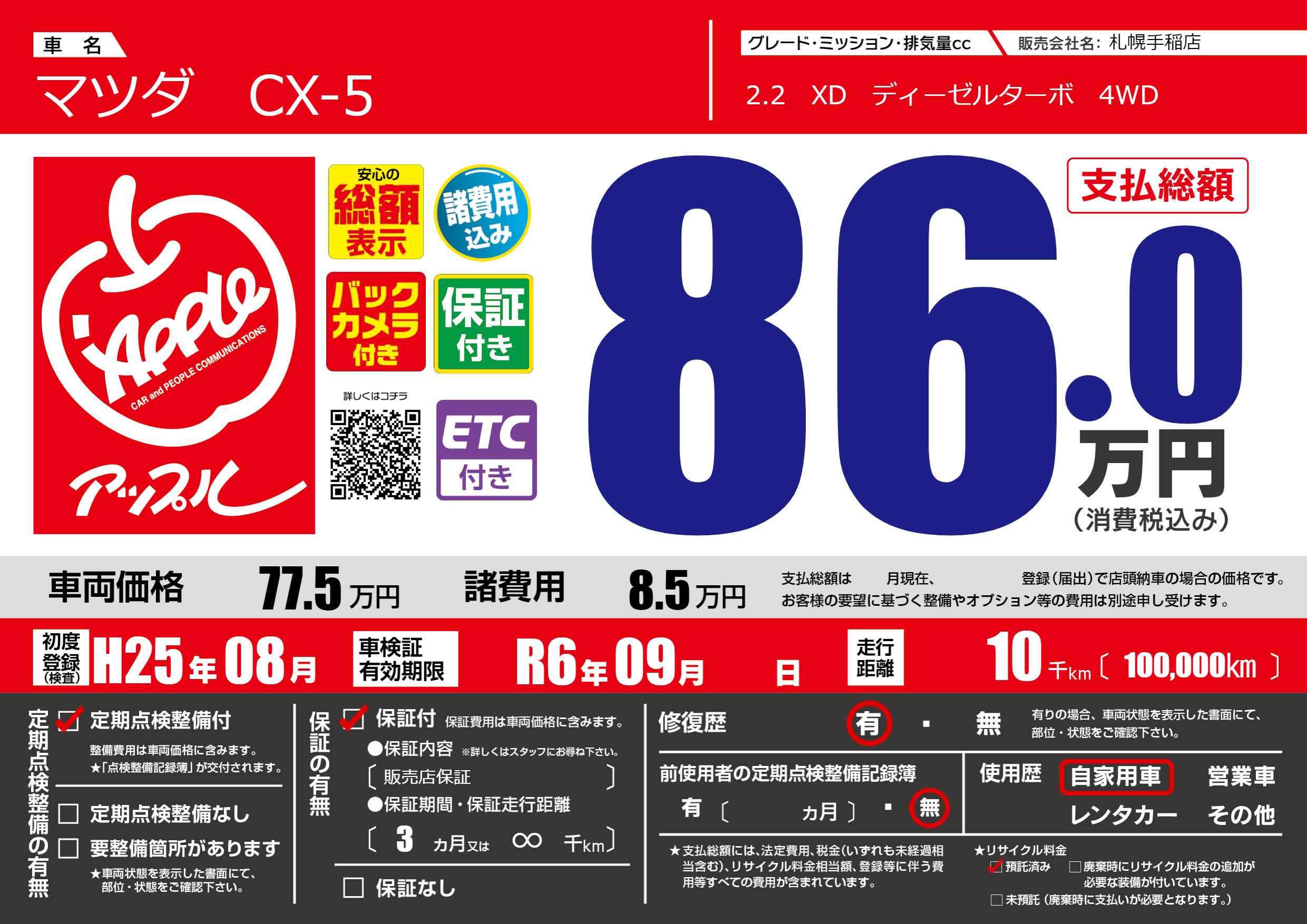 | 車名 | マツダ CX-5 | グレード ミッション 排気量 |