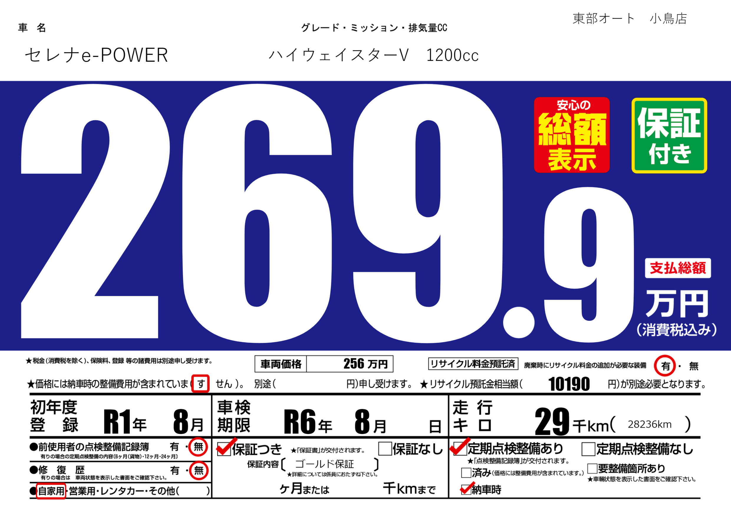 | 車名 | セレナe-POWER | グレード ミッション 排気量 |