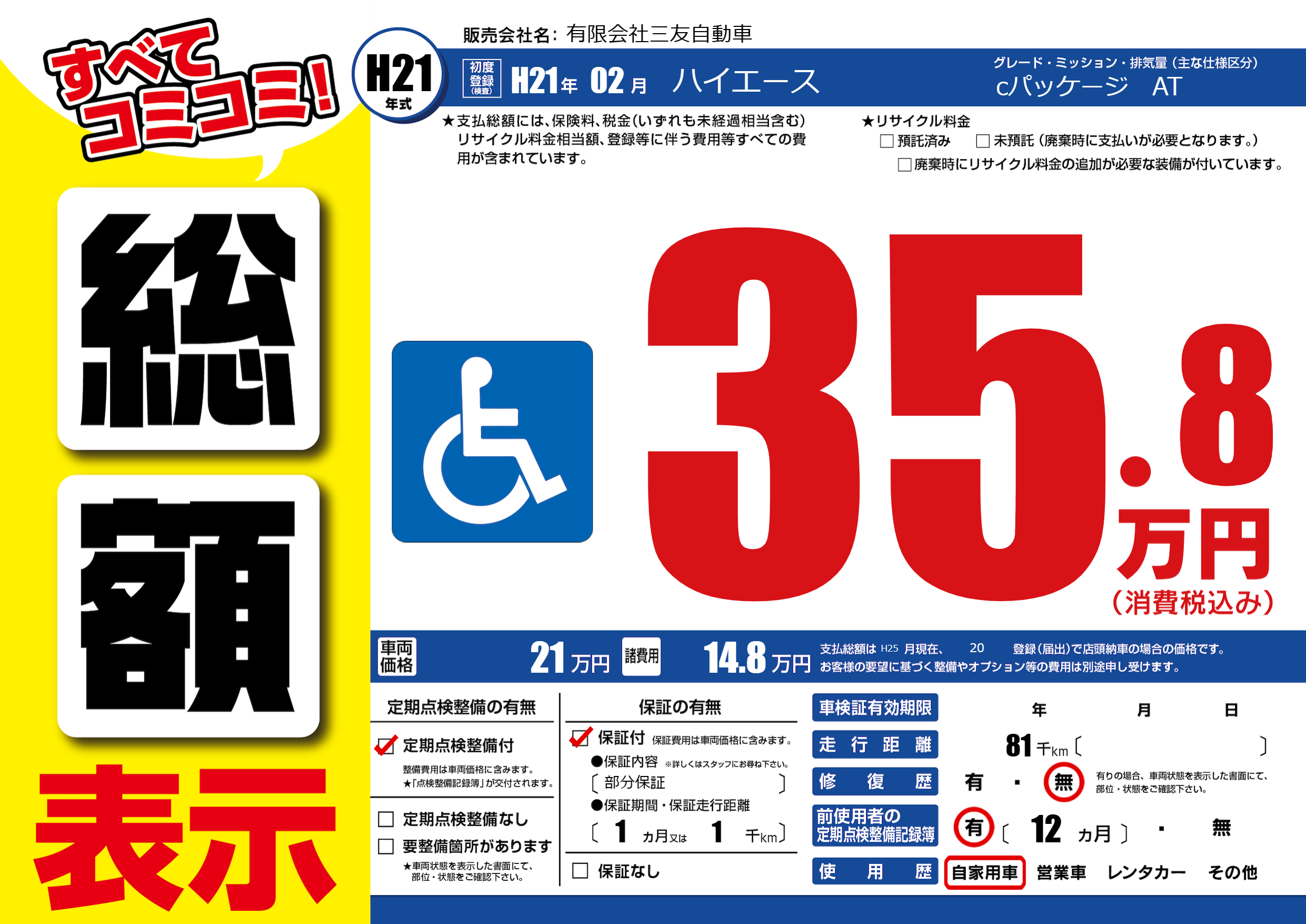 | 車名 | ハイエース | グレード ミッション 排気量 |