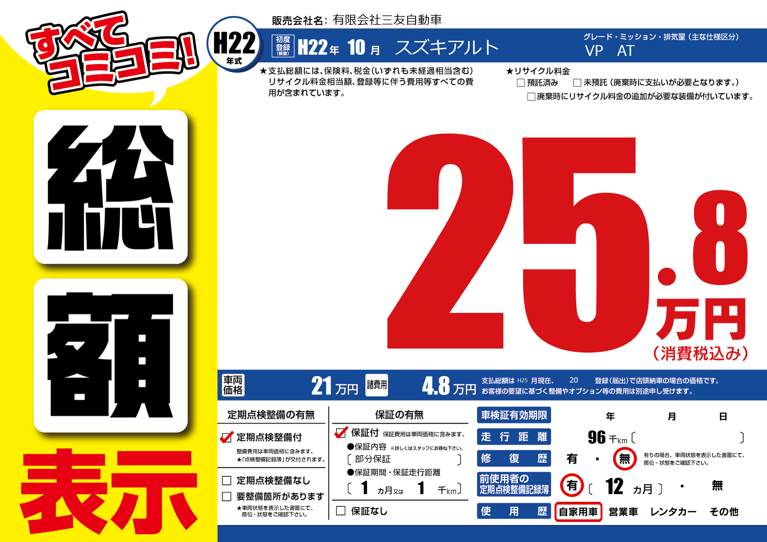 | 走行キロ | 9.6万km | 初年度登録 | H22年10月 |