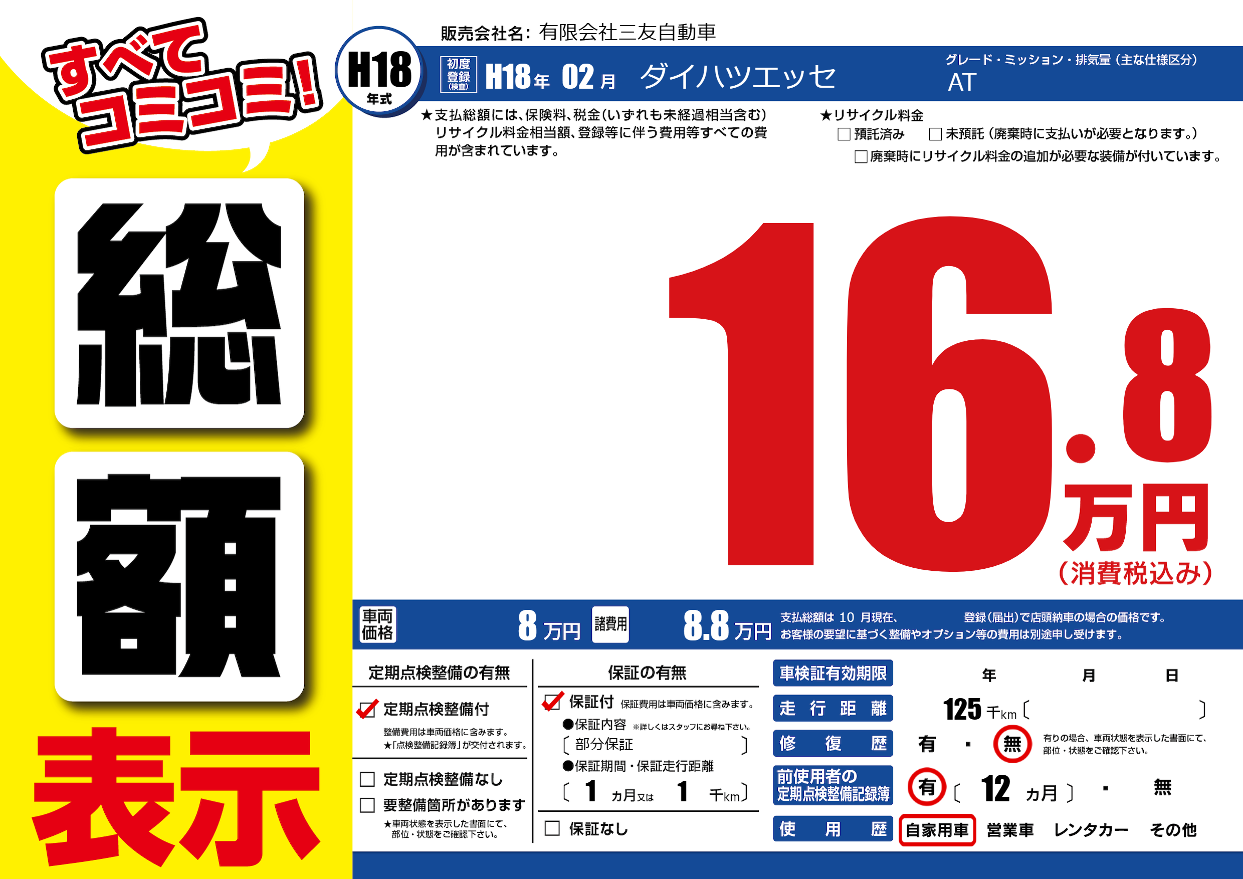 | 車名 | ダイハツエッセ | グレード ミッション 排気量 |