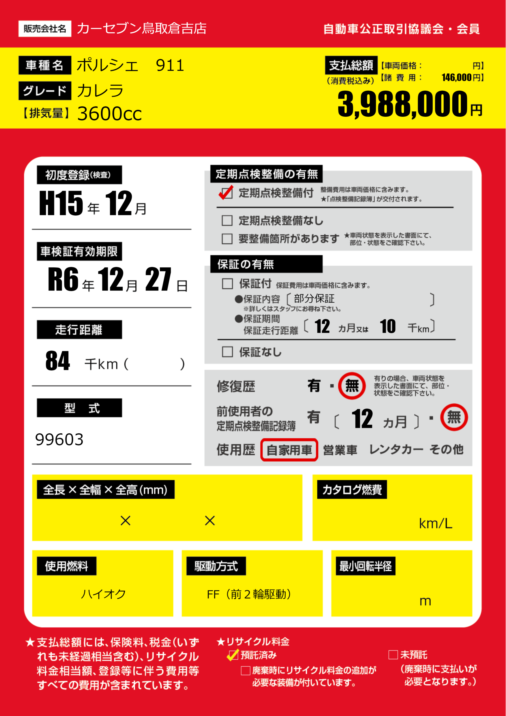 | 車名 | ポルシェ 911 | グレード ミッション 排気量 |