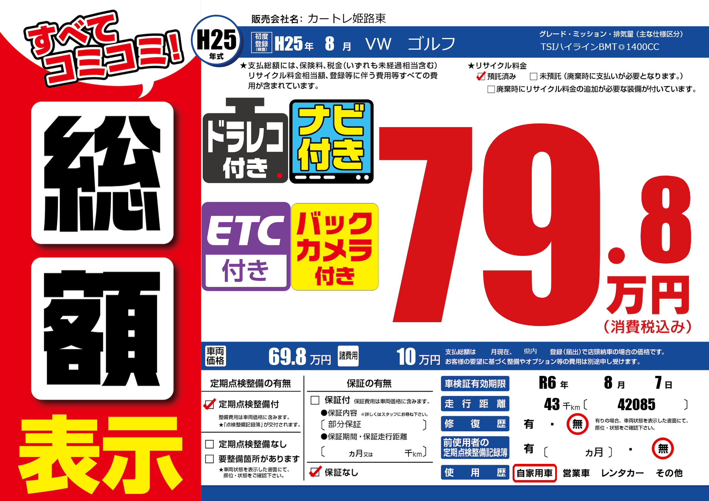 | 車名 | VW ゴルフ | グレード ミッション 排気量 |