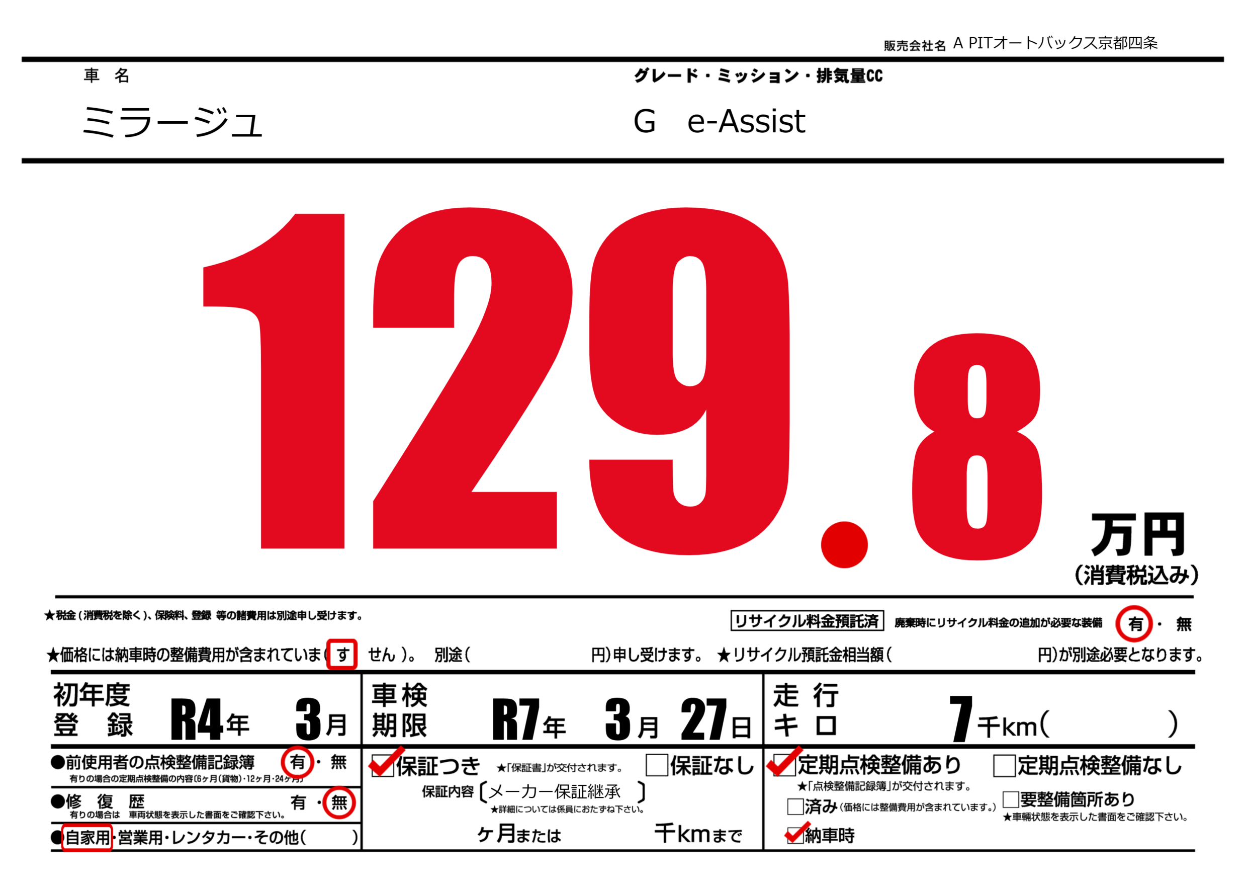 | 走行キロ | 0.7万km | 初年度登録 | R4年3月 |