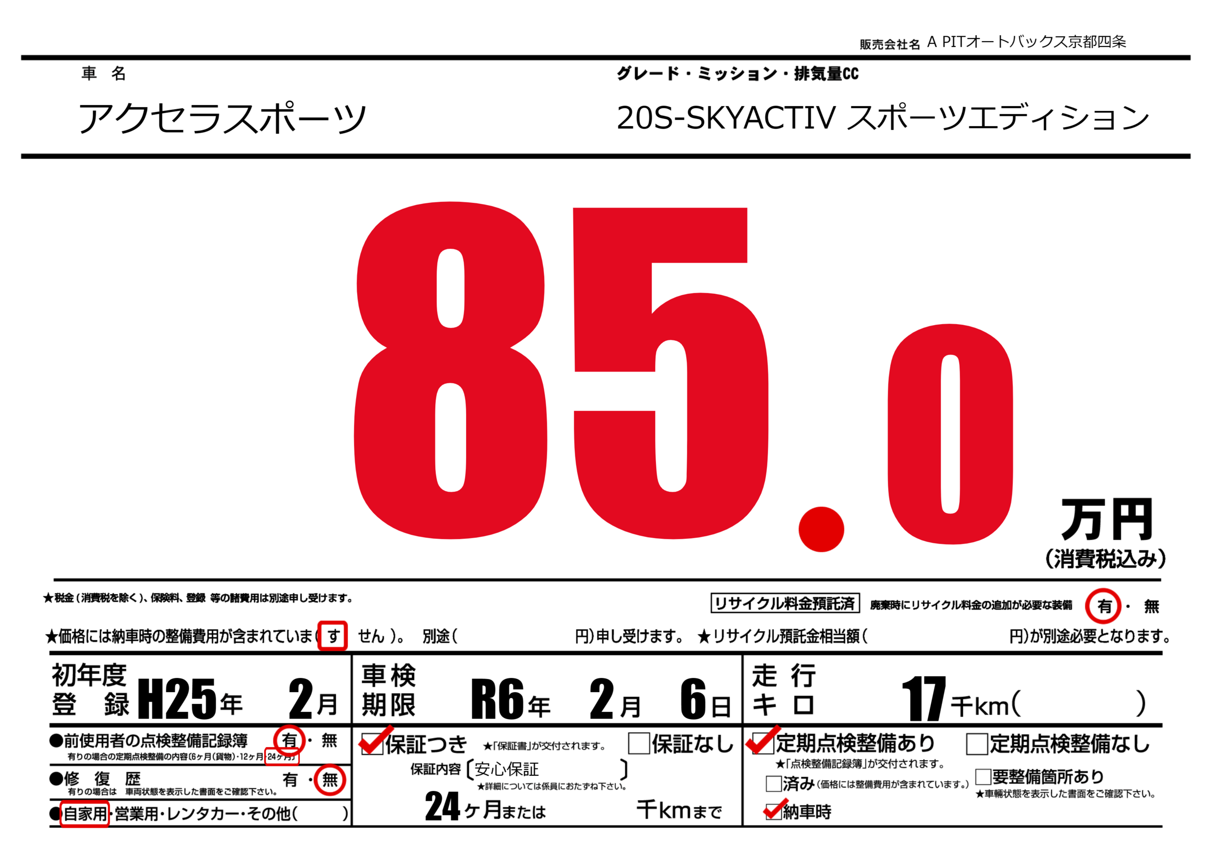 | 車名 | アクセラスポーツ | グレード ミッション 排気量 |