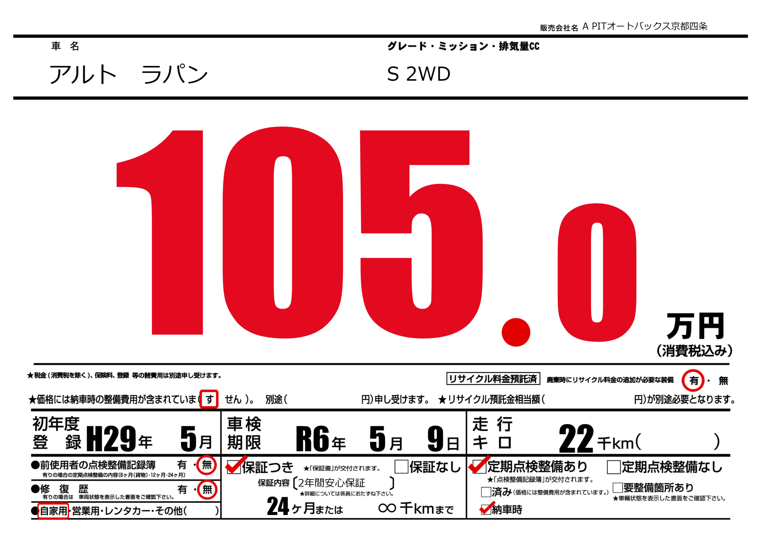 | 車名 | アルト ラパン | グレード ミッション 排気量 |