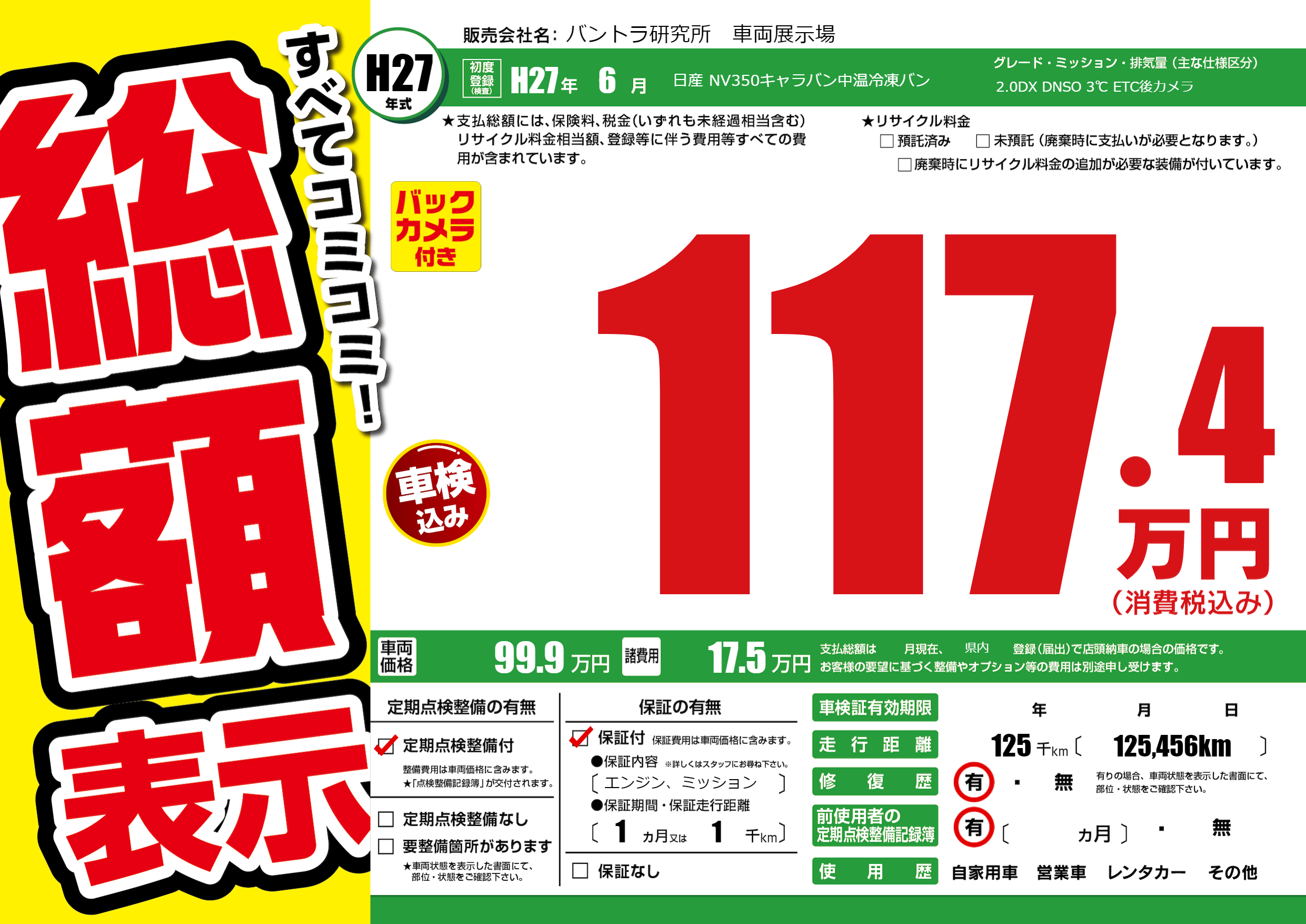 | 車名 | 日産 NV350キャラバン中温冷凍バン | グレード ミッション 排気量 |