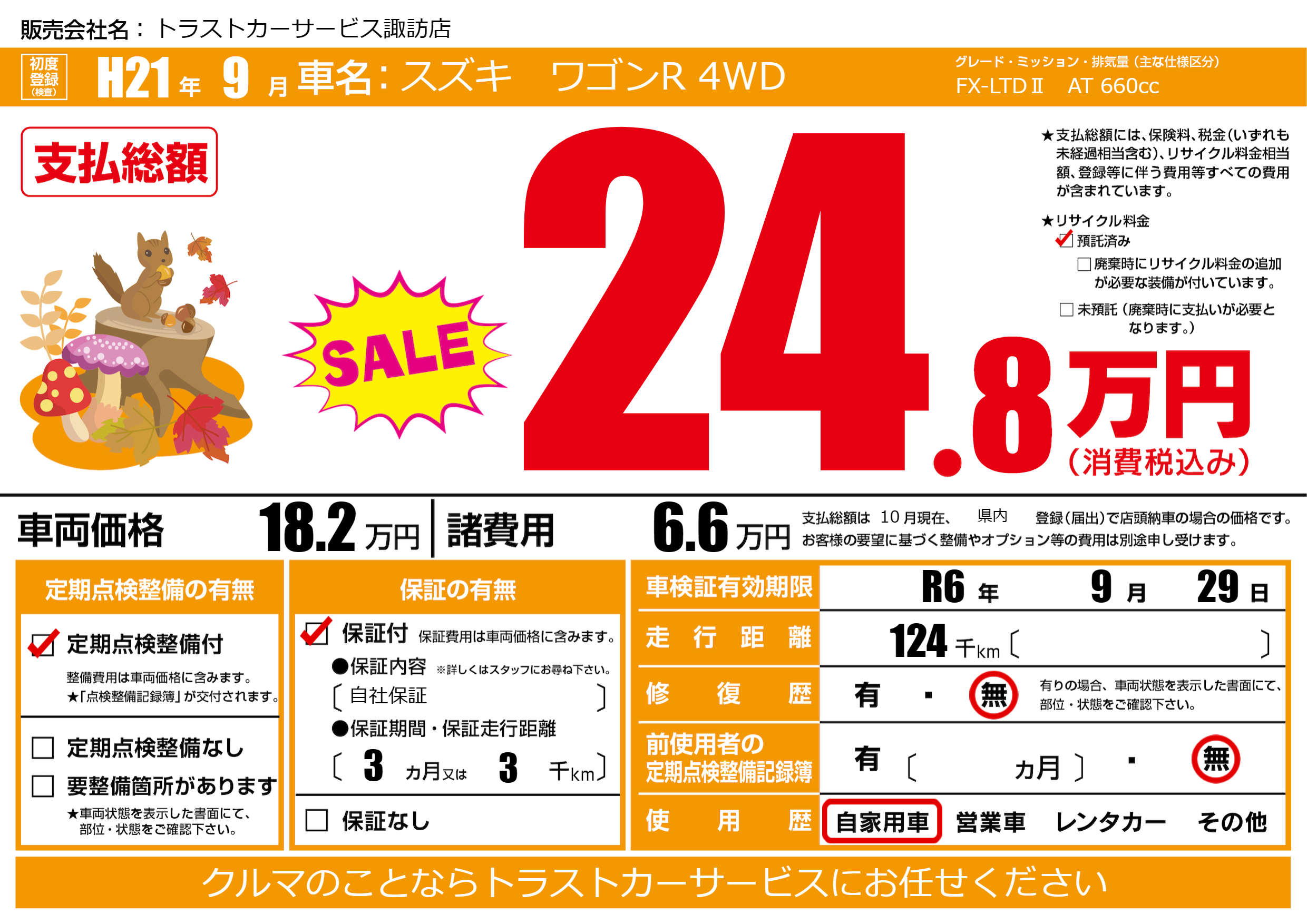 | 車名 | スズキ ワゴンR 4WD | グレード ミッション 排気量 |