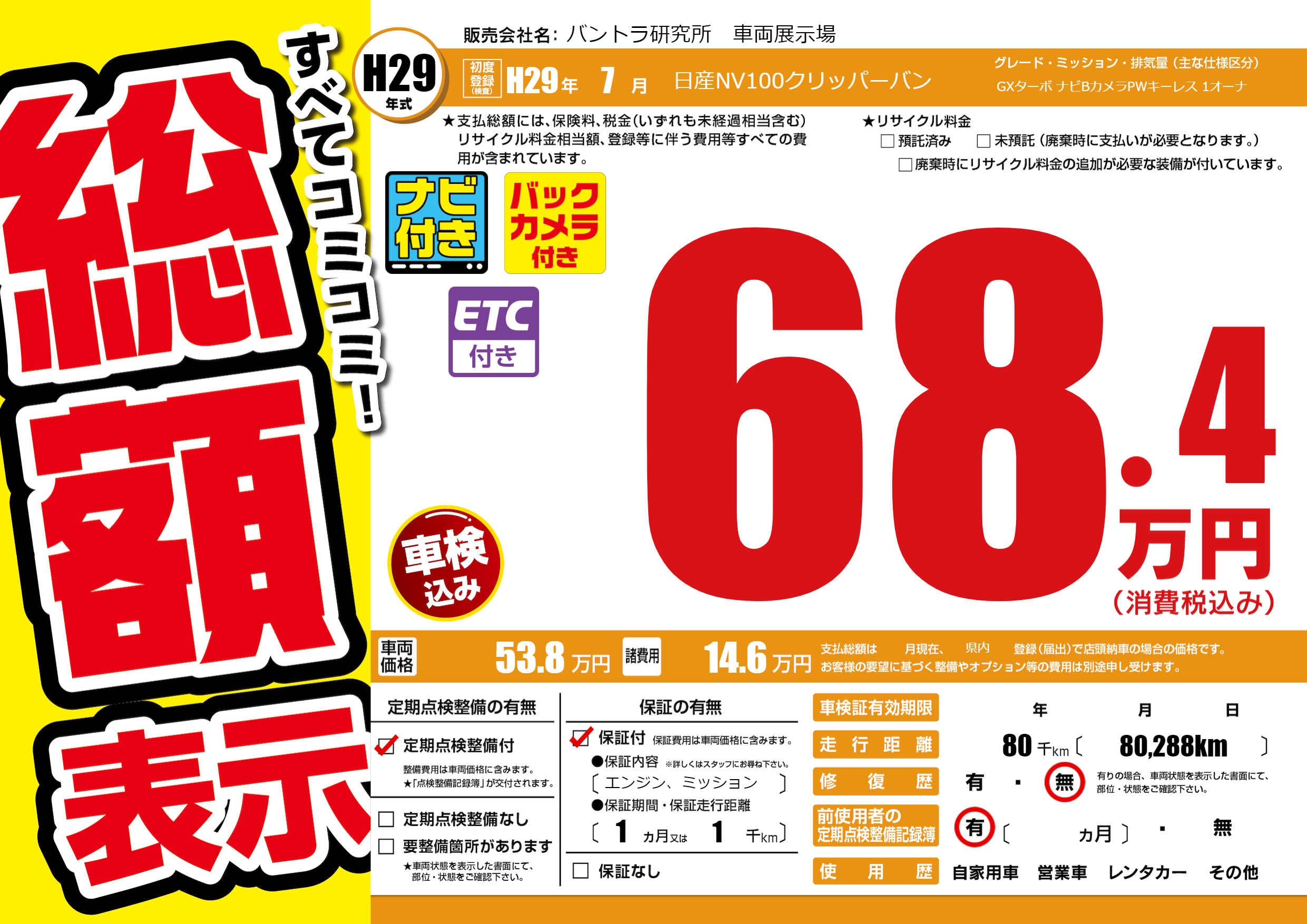 | 車名 | 日産NV100クリッパーバン | グレード ミッション 排気量 |