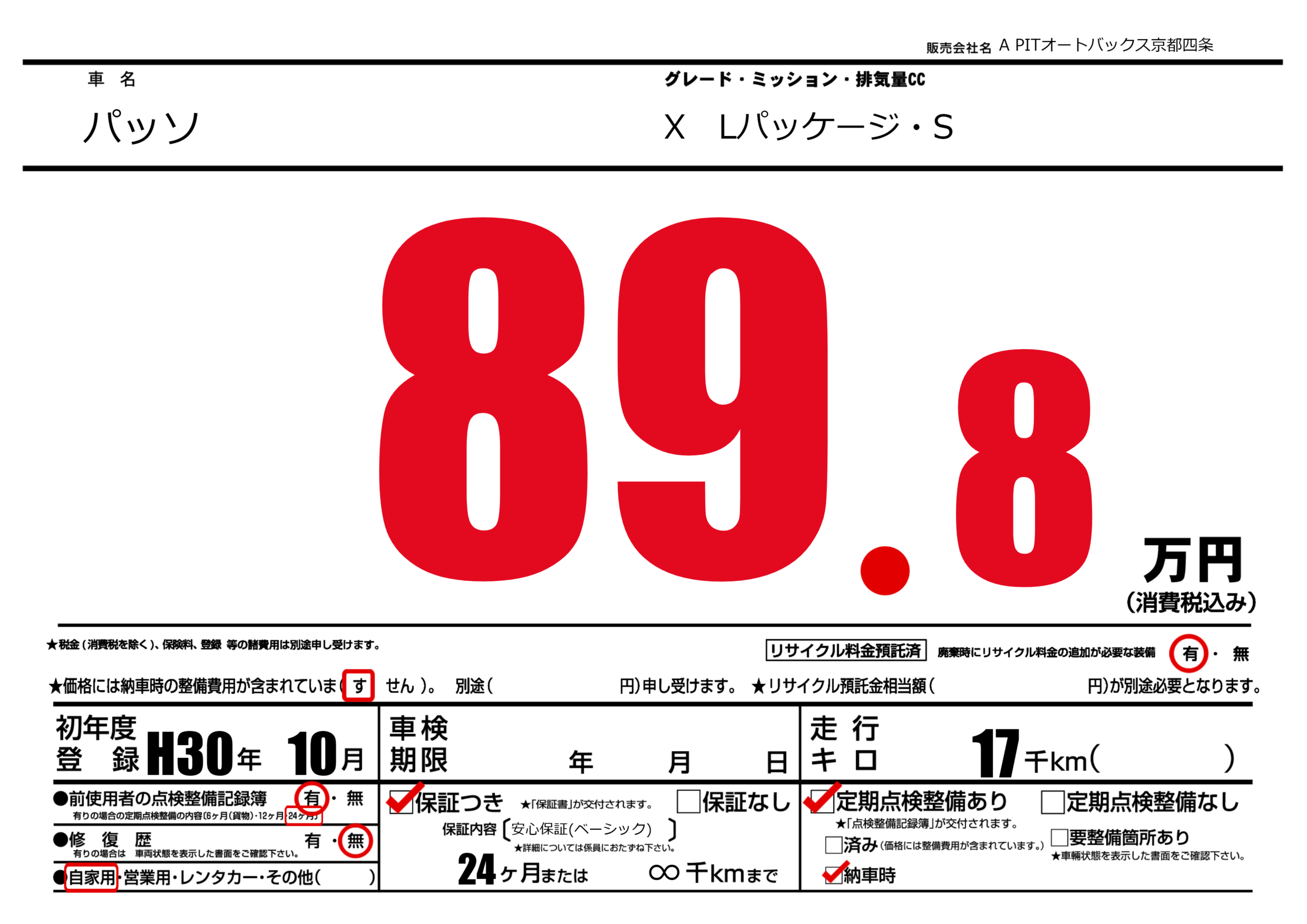 | 車名 | パッソ | グレード ミッション 排気量 |