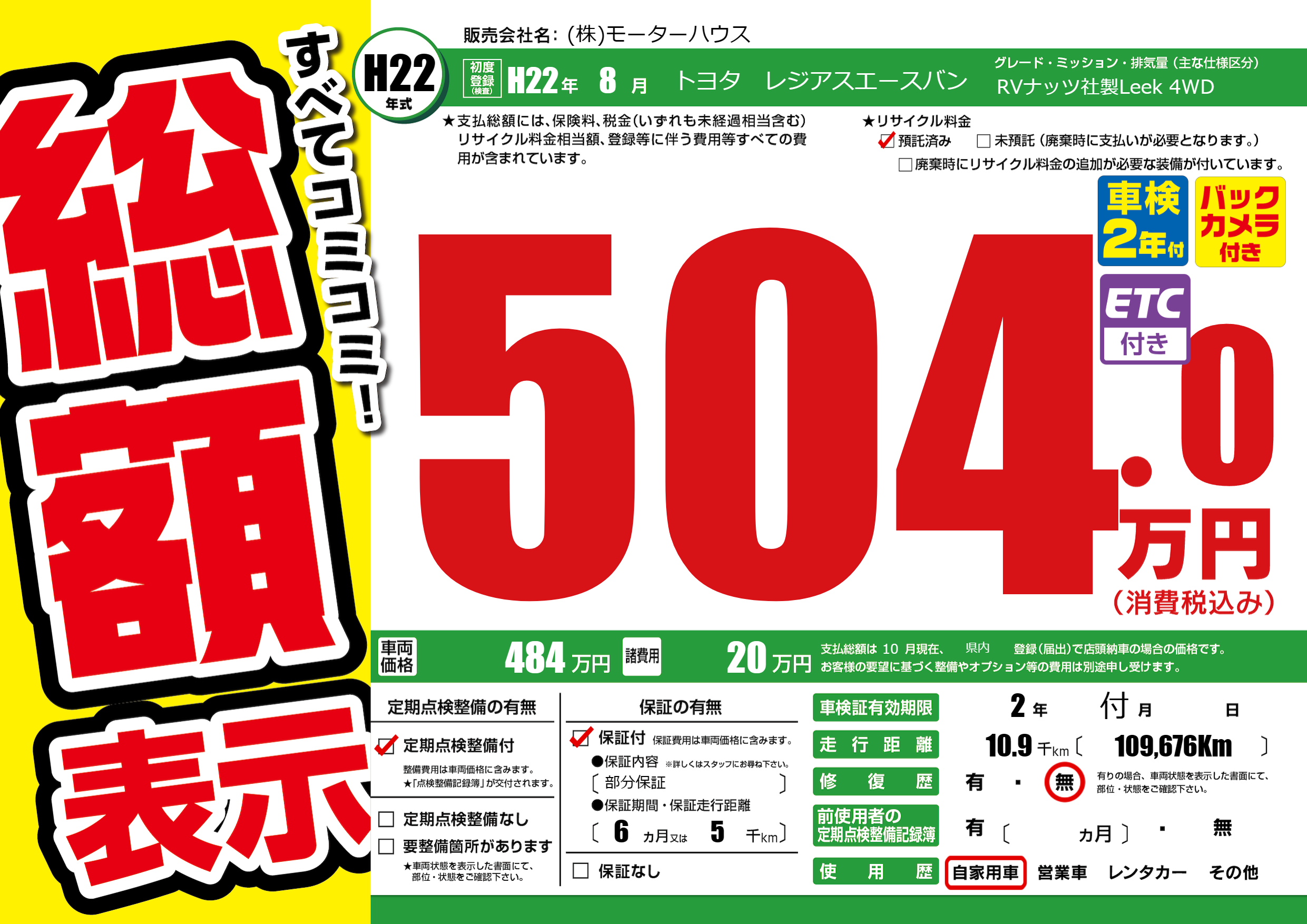 | 車名 | トヨタ レジアスエースバン | グレード ミッション 排気量 |