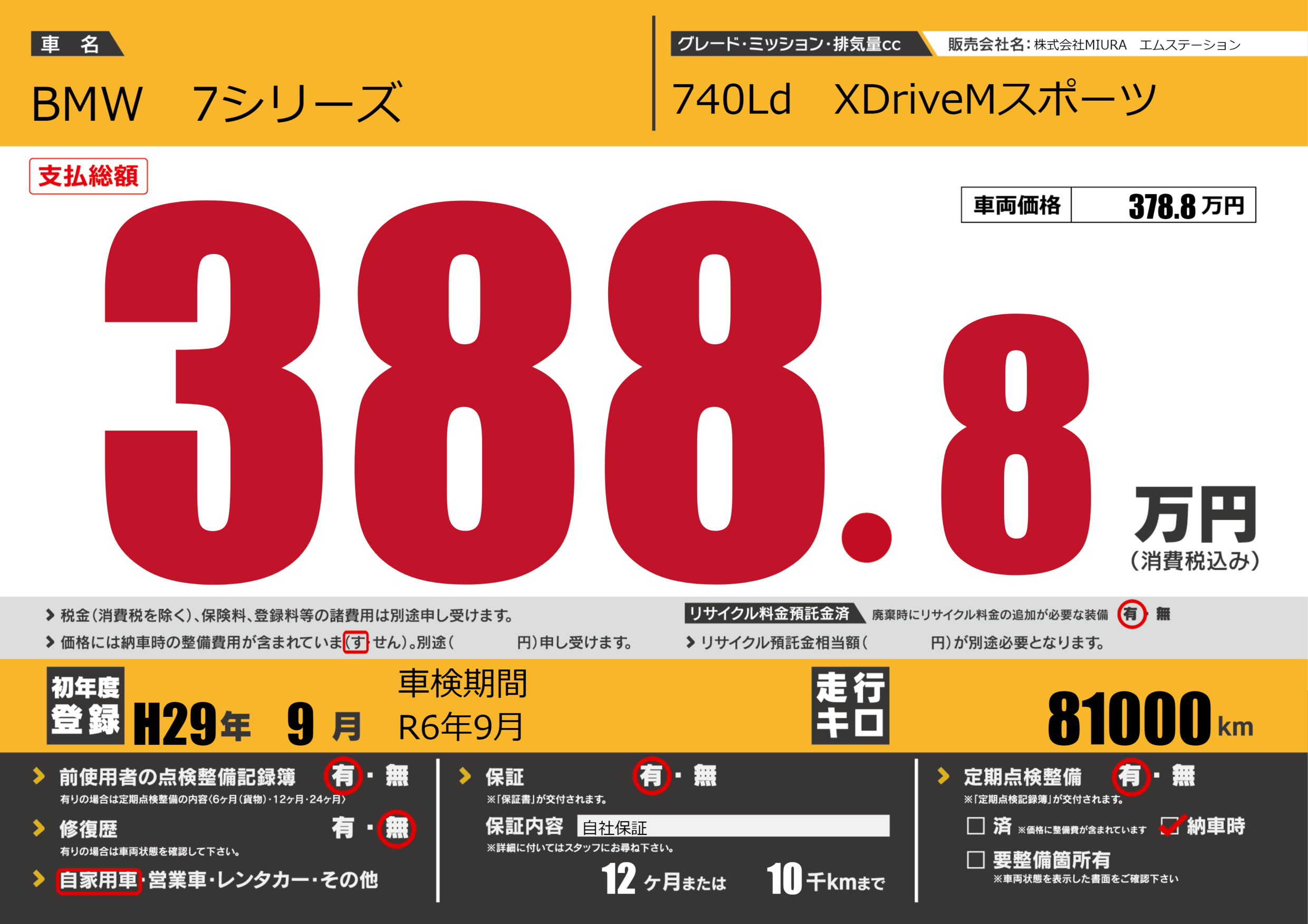 | 車名 | BMW 7シリーズ | グレード ミッション 排気量 |