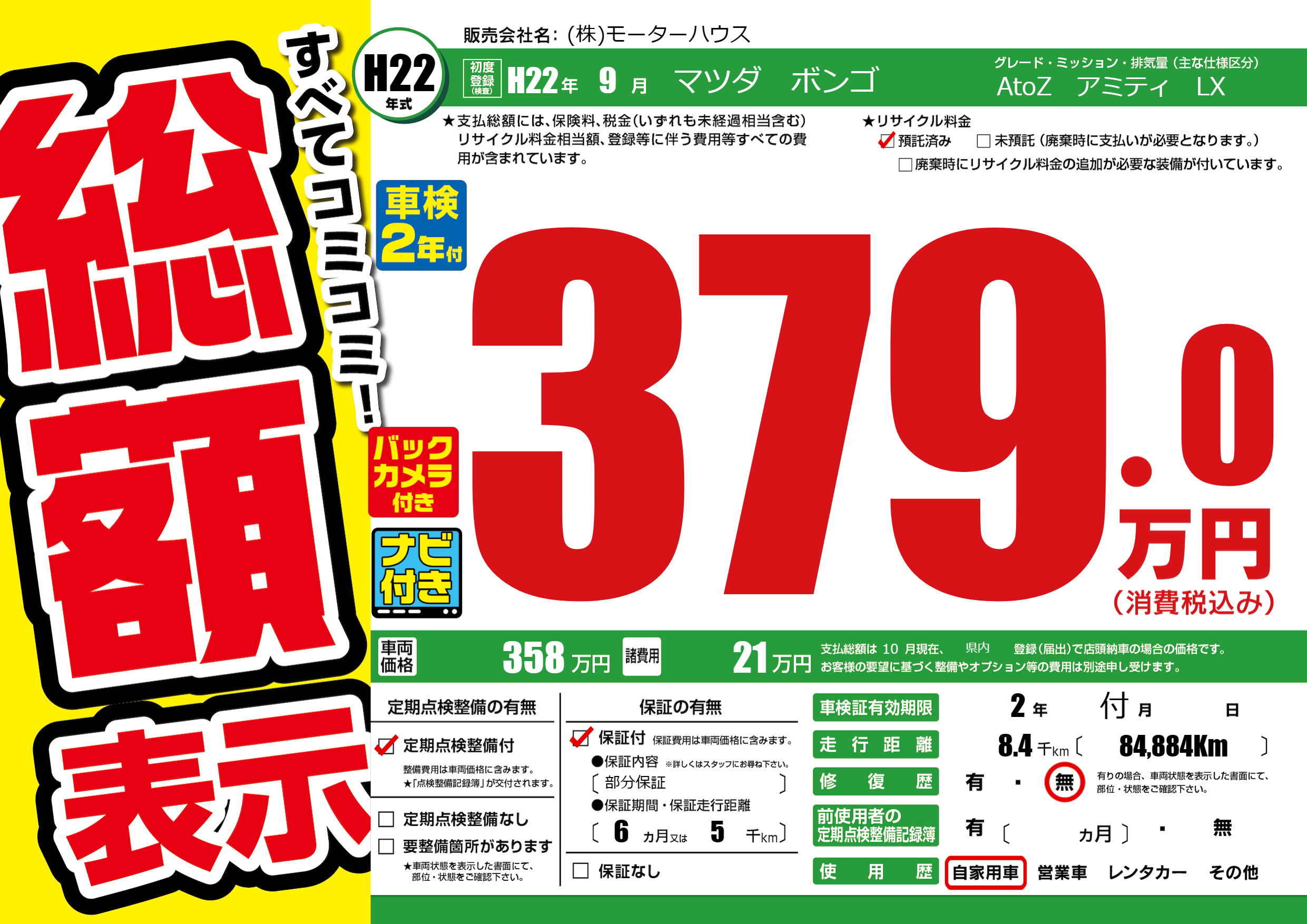 | 走行キロ | 0.8万km | 初年度登録 | H22年9月 |
