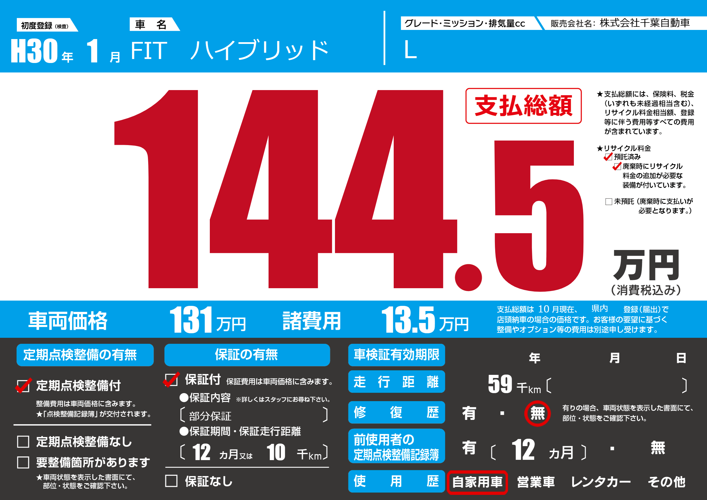 あり | リサイクル預託金相当額 | ( 0円)が別途必要 |