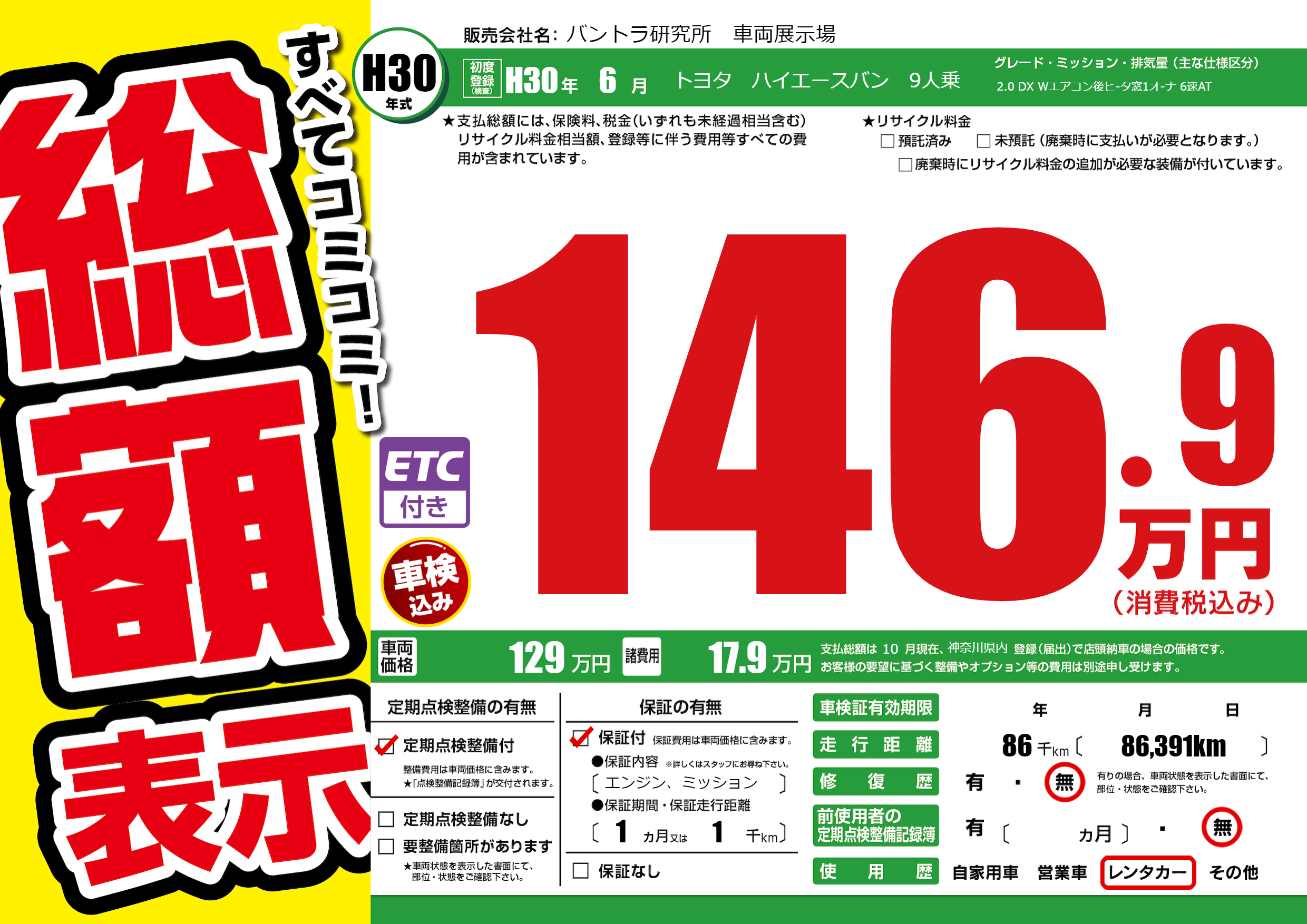 | 車名 | トヨタ ハイエースバン 9人乗 | グレード ミッション 排気量 |