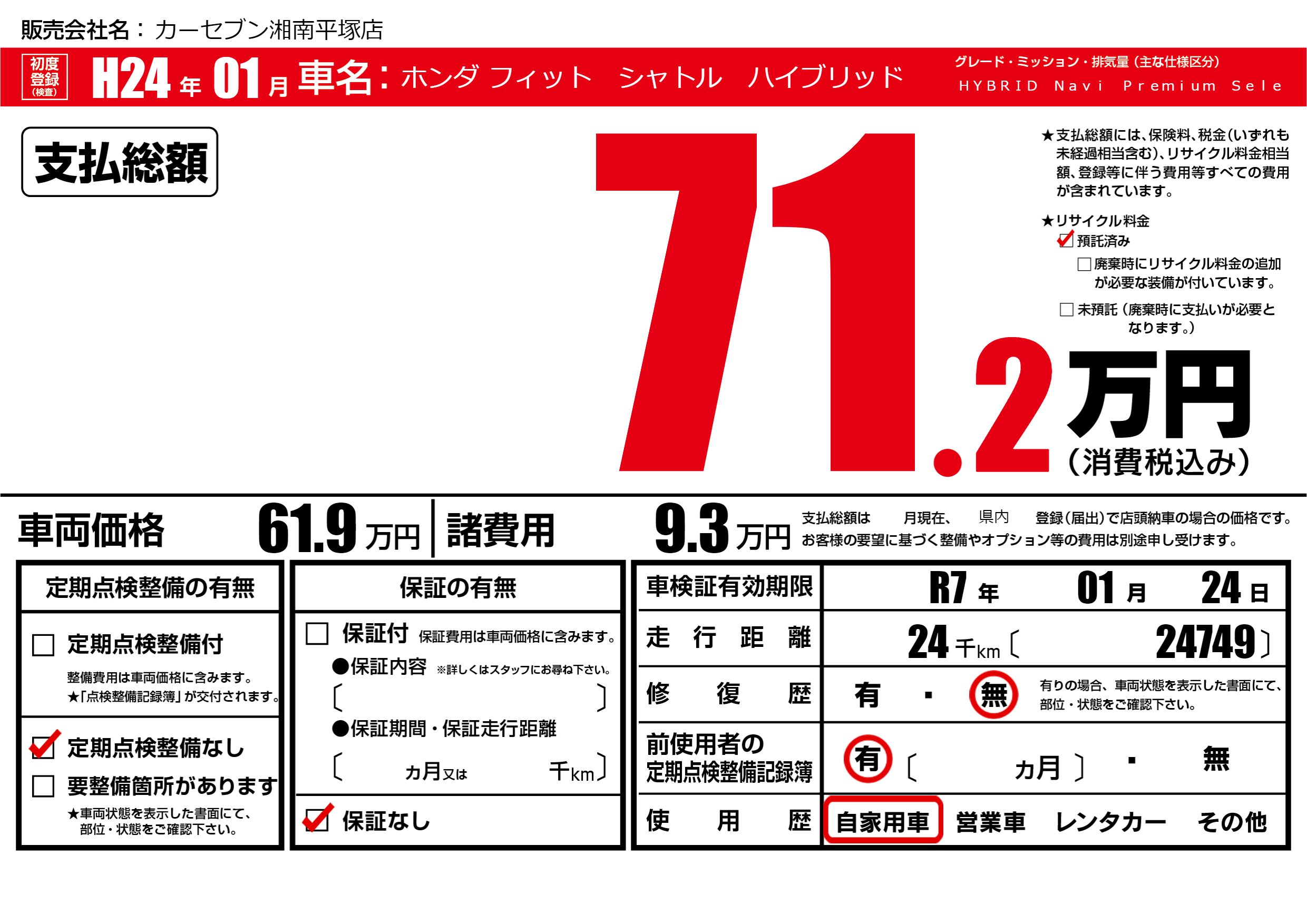 | 車名 | ホンダ フィット シャトル ハイブリッド | グレード ミッション 排気量 |